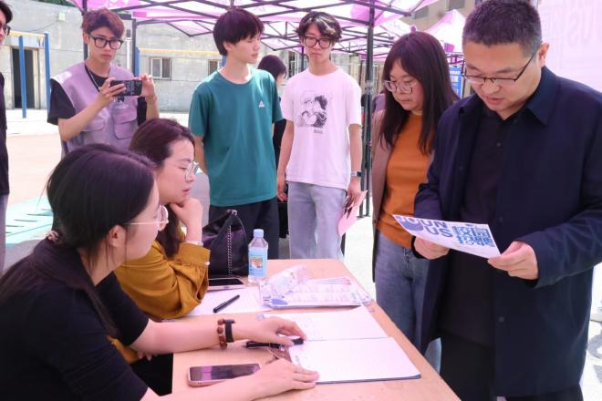 美术学院党委书记辛源,团总支书记邹少爽,辅导员杨茜走进招聘会现场参加活动,与用人单位接洽交谈,感谢用人单位对学院人才培养工作的认可和支持,并详细了解用人单位岗位设置和招聘需求,同时与现场应聘的毕业生和在校生深入交谈,鼓励同学们积极就业,根据专业特长和兴趣方向选择未来发展方向,针对企业用人需求进行精准推荐,助力毕业生早就业、就好业。