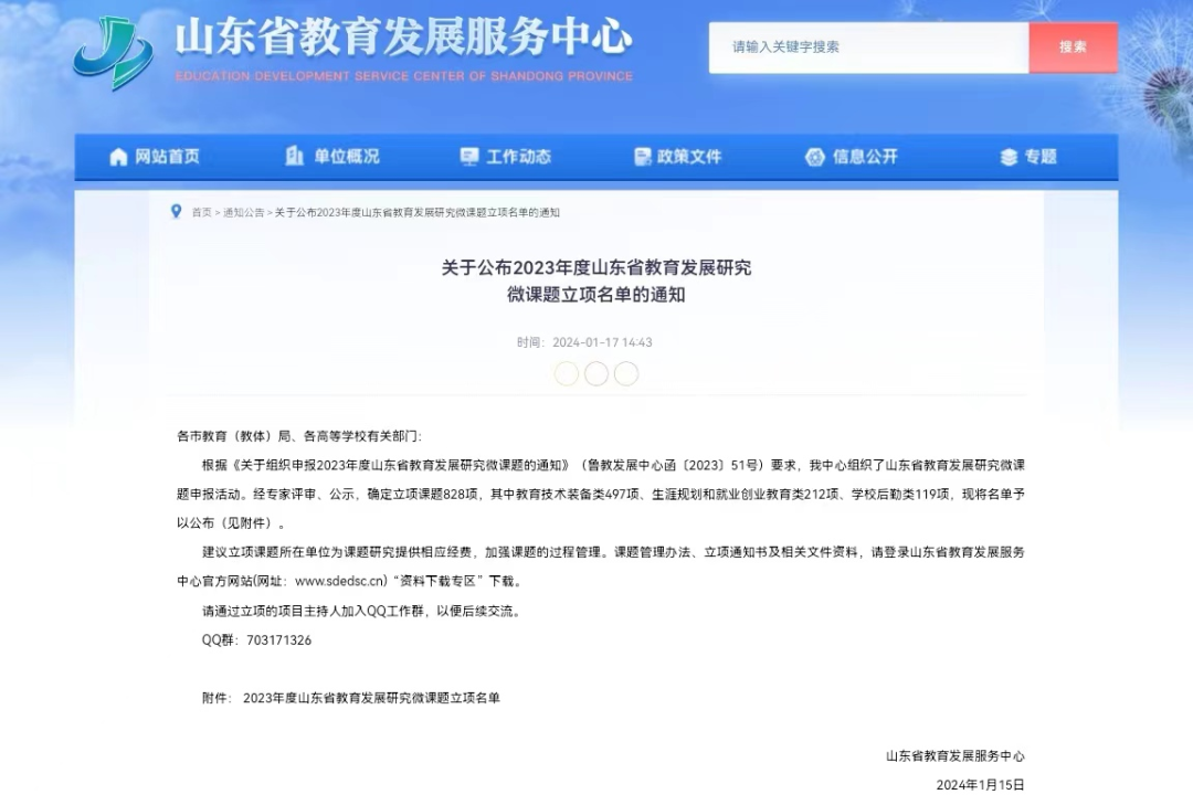 据悉,根据《关于组织申报2023年度山东省教育发展研究微课题的通知》(鲁教发展中心函〔2023〕51号)通知精神,共收到立项申请15613项,经专家评审,拟确定立项课题828项,其中教育技术装备类497项、生涯规划和就业创业教育类212项、学校后勤类119项。