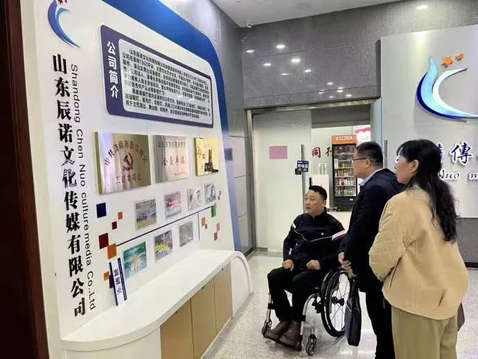 在山东辰诺文化传媒有限公司,辛源一行与公司总经理李伟、副总经理王瑞进行了交流,参观凤凰演播厅、党建文化墙、电商直播间、书画培训中心等。李伟介绍了公司发展情况、创业经历和开展的社会公益事业。辛源介绍了美术学院基本情况,表示学院毕业生专业同企业岗位需求契合度很高,希望有机会加强合作,为毕业生提供就业岗位和实习、实践的机会,共同促进校企双方互惠共赢。