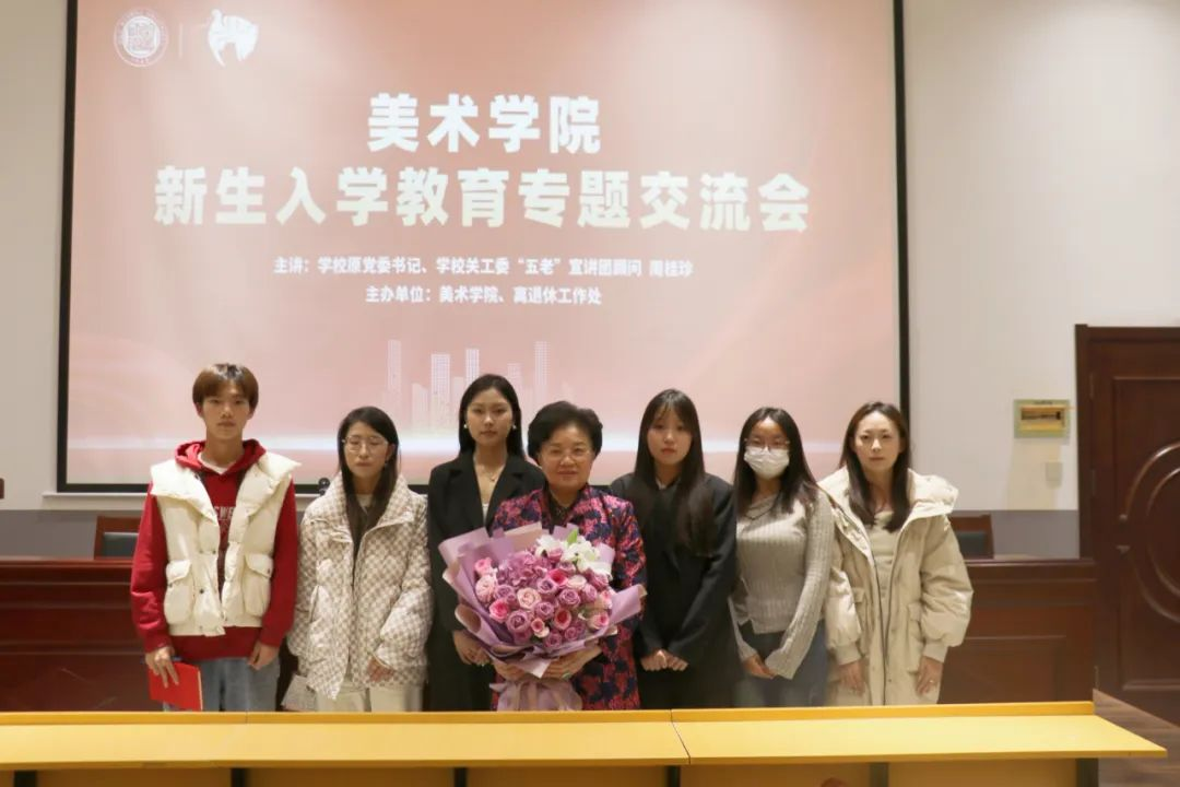 11月10日下午,美术学院特邀学校原党委书记、学校关工委“五老”宣讲团顾问周桂珍面向2023级全体新生进行专题交流,为同学们讲授别开生面的一堂公开课。学校党委委员、党委统战部部长宋新刚主持交流会。美术学院党委书记辛源,院长杨三军,团总支书记邹少爽及辅导员刘婷、杨茜参加活动。
