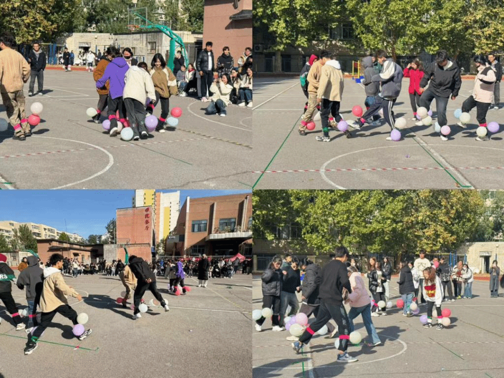 同学们脚绑气球,你追我赶,趁其不备,果断下脚,运用逐个突破或团队群攻的方式突破对手防线,赛场上下洋溢着欢快的笑声。