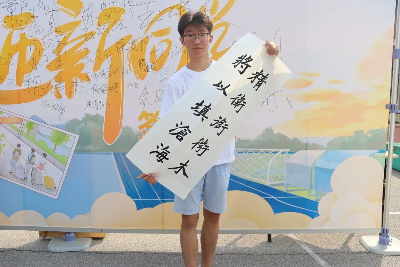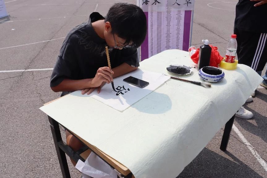 为彰显书法专业特色,弘扬中国优秀传统文化,美术学院在活动采访处摆放文房四宝。才华横溢的新生们竞相登场、跃跃欲试,伴随着一抹浓浓的墨香,一支支毛笔在他们手中纵横跳跃,一个个汉字或工整温润,或丰筋多力。“莫道君行早,更有早行人”“欲穷千里目,更上一层楼”……每一幅字都承载着美院人对新起点的期许与展望,在轻松有趣的氛围里,文字相连汇聚为美术学院的新生力量。