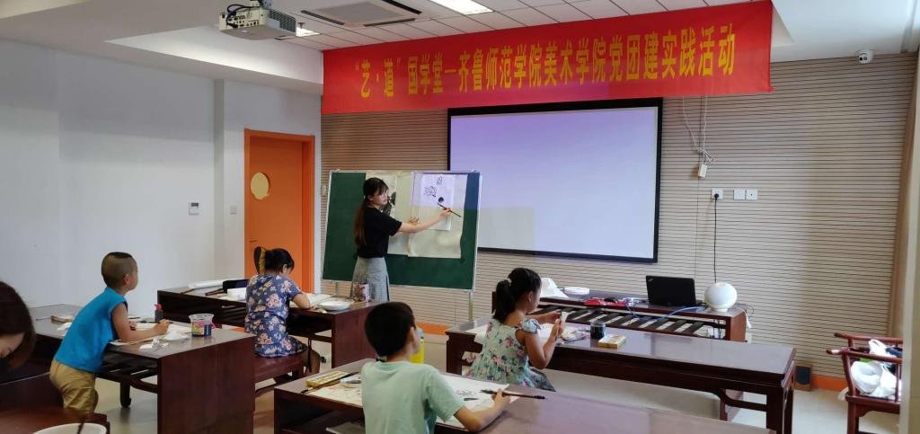 该学堂是齐鲁师范学院美术学院特色党团实践基地,是由齐鲁师范学院美术学院教师党员和学生党团志愿者为主体参与,结合党员教师和学生自身专业来开展活动,充分发挥齐鲁师范学院美术学院特长。第一期试授课圆满收官,主要以中国画中的传统花鸟画题材为主要教学对象,以“柿子”、“菊花”、“荷花”等为例,让儿童“了解基本知识,掌握基本技能,提升欣赏水平,增强艺术修养”为目的,以传统文化与艺术经典教育结合的方式,教授儿童学习中国画的基础知识和表现技能。课堂教学形式丰富,师生之间的配合非常默契。通过学习,既培养了儿童的审美和鉴赏能力,又提高了他们的绘画技能。活动充分体现了“艺·道”公益国学堂秉承“劳作上手,书画养心”的精神,寓教于乐,将手工技艺与尚学精神结合,帮助公众了解和体验传统国画的精妙技艺,弘扬传统文化,传播正能量,用国学智慧和传统文化艺术托起明天的太阳。