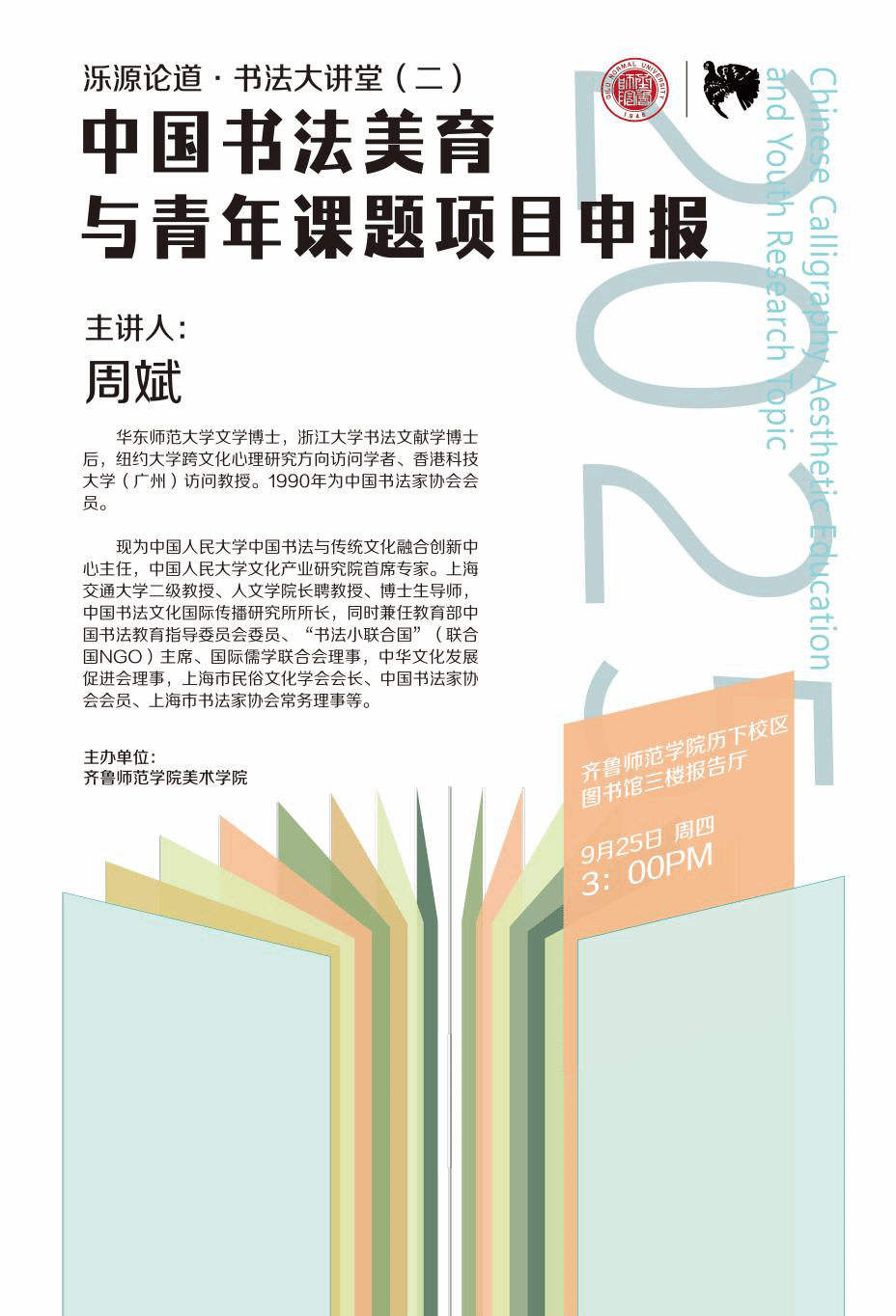 9月25日,中国人民大学中国书法与传统文化融合创新中心主任,中国人民大学文化产业研究院首席专家,上海交通大学二级教授、人文学院长聘教授、博士生导师,中国书法文化国际传播研究所所长周斌教授应邀莅临齐鲁师范学院美术学院,与学院青年教师代表就青年课题项目申报等相关议题进行学术座谈,并在美术学院学术报告厅为学院师生作题为《中国书法美育与书法审美》的学术讲座。此学术讲座为美术学院泺源论道·书法大讲堂第二场学术活动。