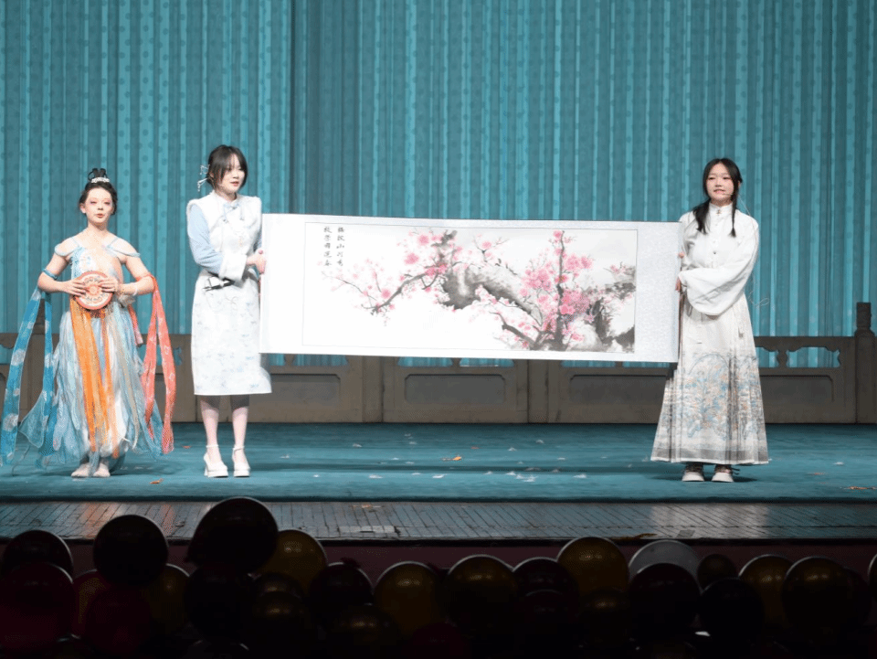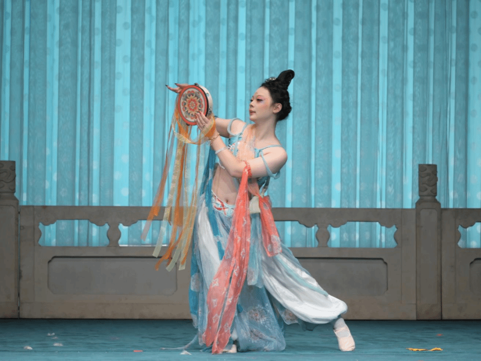 铃鼓清脆,穿越千年戈壁与莫高窟。这支异域风情舞蹈,再现古丝绸之路繁华。舞者服饰特色鲜明,随节奏灵动起舞,尽显丝路文化印记;作画者伴随铃鼓的清脆节奏,画出梅的品性,体悟中华优秀传统文化的底蕴。