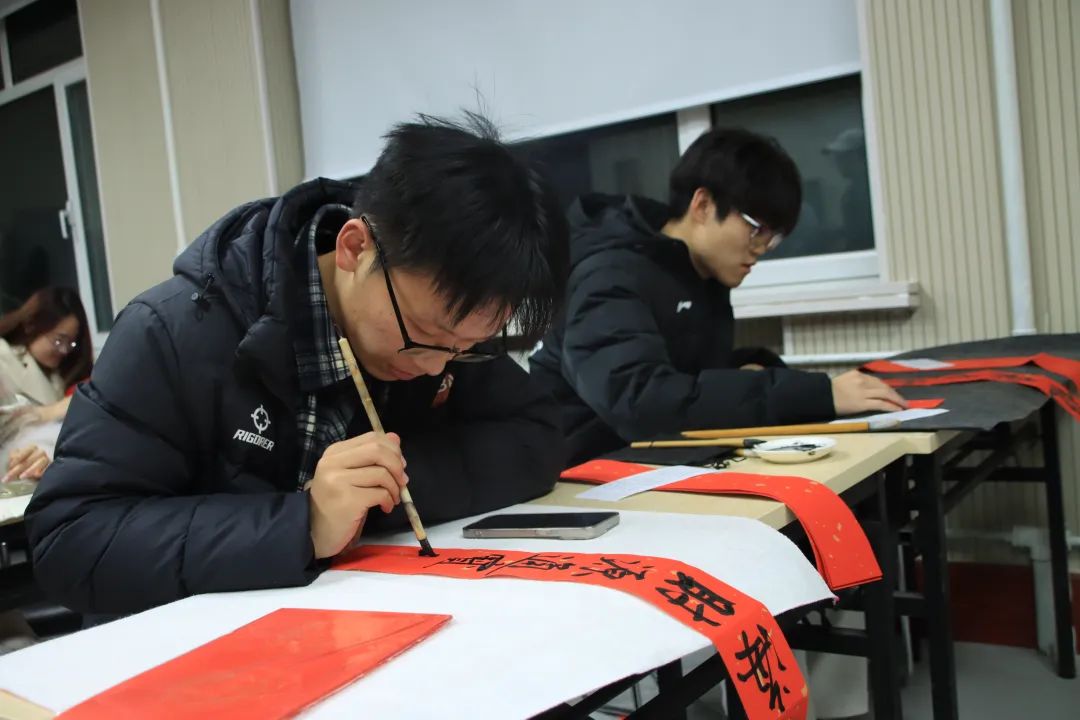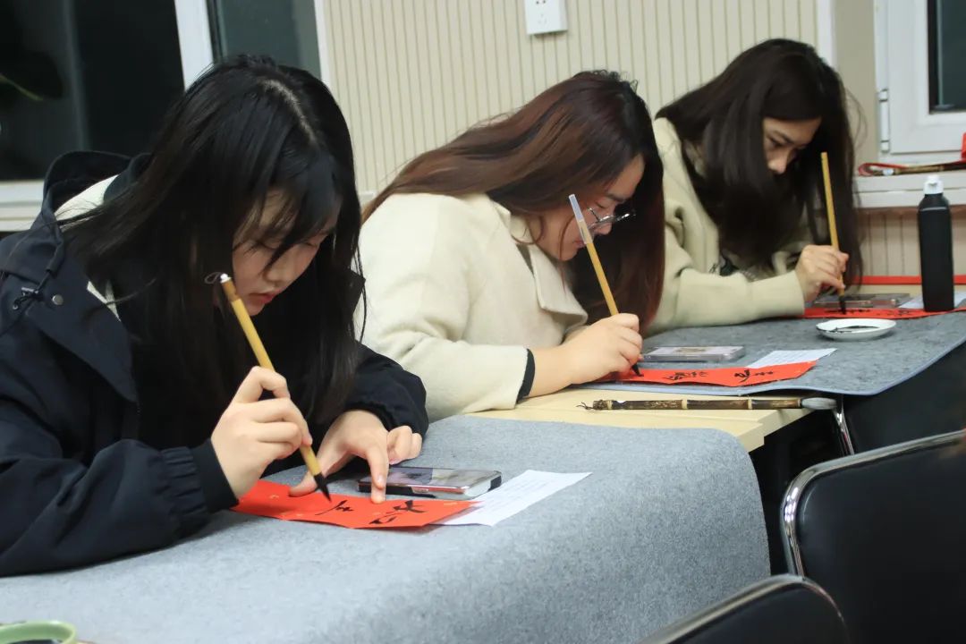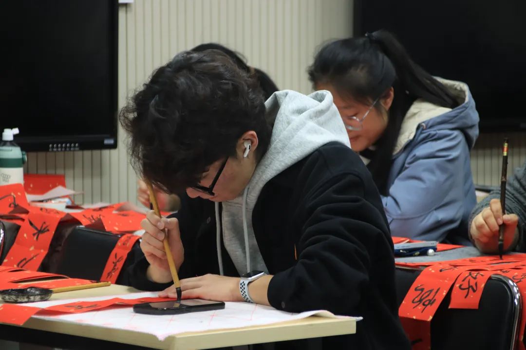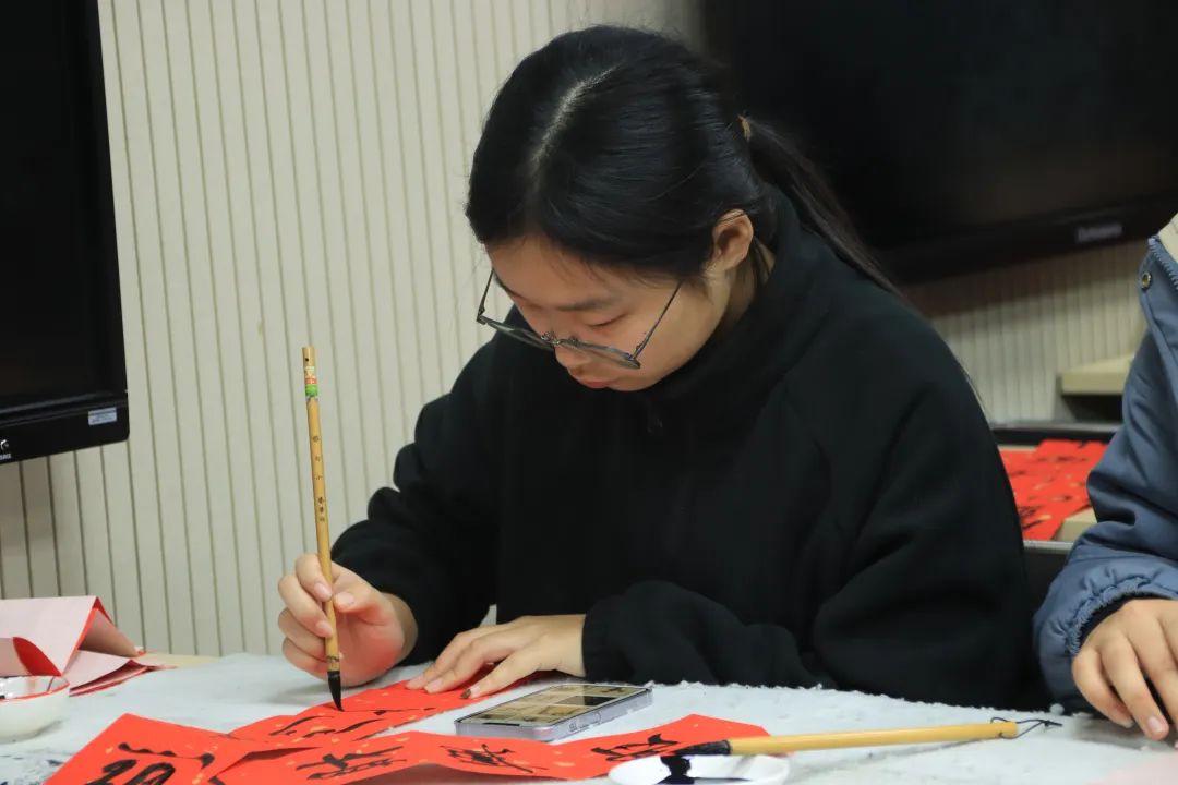 铺纸、蘸墨、起笔……到场的同学们挥毫泼墨,专注于笔尖,一笔一划,书写着对美好新春的祝福;一撇一捺,感受着笔墨的韵味和力量。普通的红纸,瞬间有了“年味儿”。同学们将对台湾同胞的深情厚谊融入一幅幅寓意吉祥的春联之中。字里行间既蕴含着对新年的美好憧憬,更饱含着对台湾同胞的深切关怀与思念。一幅幅寓意吉祥的对联和福字,既给节日增加了喜庆气氛,也为两岸关系传递着关爱、力量、信心和勇气。