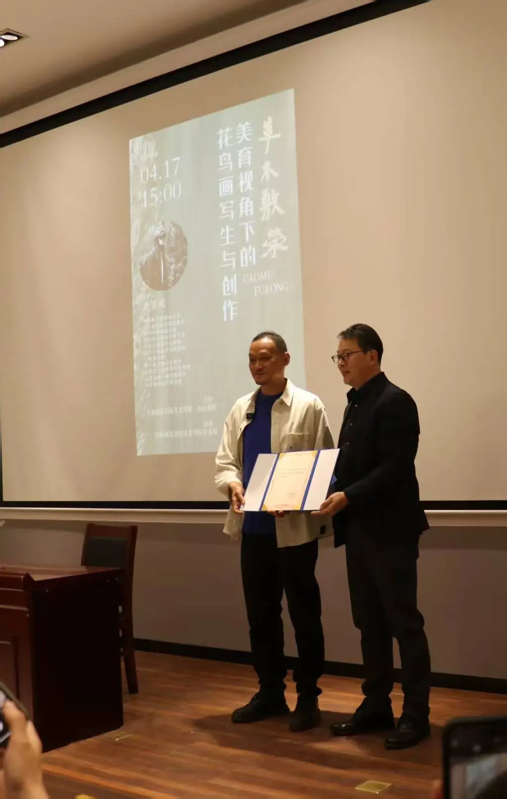 讲座中,李恩成结合自身多年的艺术实践与教学经验,从美育的角度出发,深入地讲解了花鸟画写生与创作的核心要义。他提到,花鸟画作为中国传统绘画的重要门类,不仅承载着深厚的文化底蕴,更是美育的重要载体。通过写生,艺术家能够深入观察自然,捕捉物象的神韵,而创作则是对自然之美的高度提炼与艺术表达。
