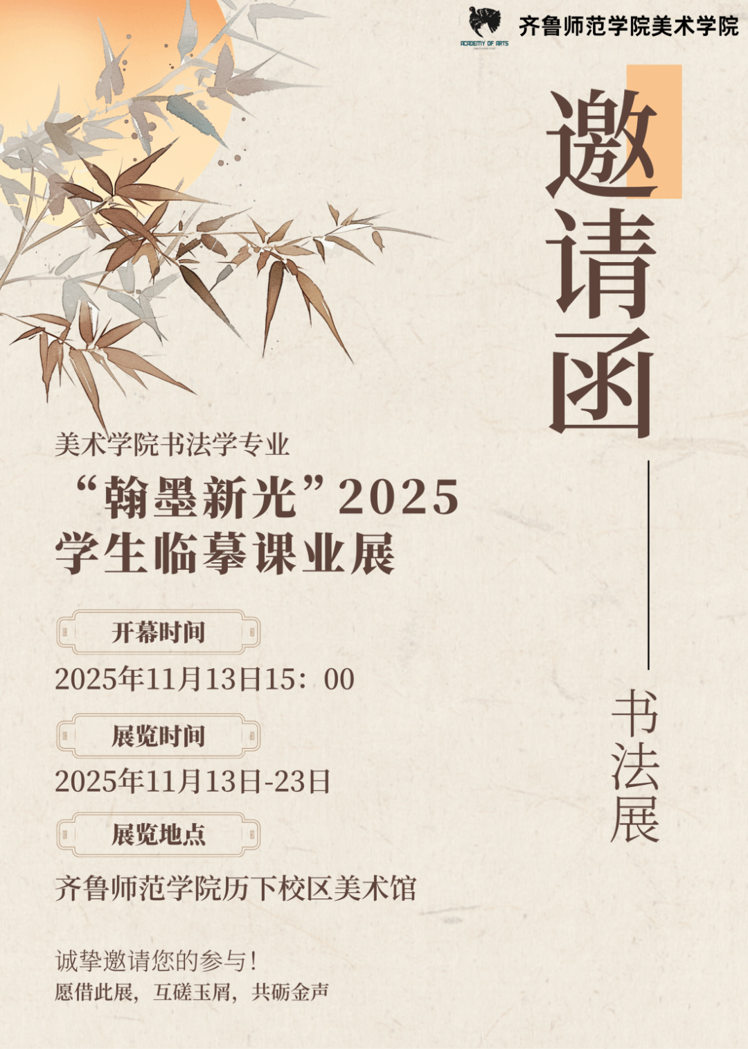 当千年笔墨邂逅青春匠心,一场关于传统与传承的书法展即将拉开帷幕。齐鲁师范学院美术学院书法学专业“翰墨新光”2025学生临摹课业展,将于2025年11月13日-23日开展,诚邀您共赏笔墨间的传承与创新。