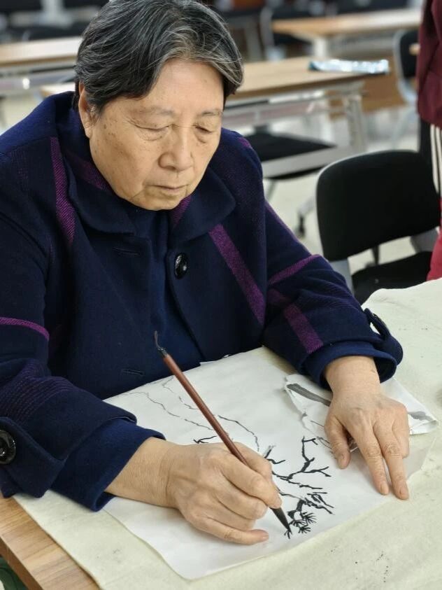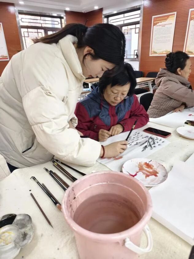 活动现场,美术学院国画班的学生代表化身文化使者,手把手教社区老人们勾勒岁寒三友的风骨。一笔一画晕染墨色,一勾一勒尽显神韵,老人们专注的神情里,藏着对传统文化的热爱与向往,无需深厚功底,只需随心落笔,便能在笔墨流转间感受传统书画的魅力,体会君子品格的内涵。