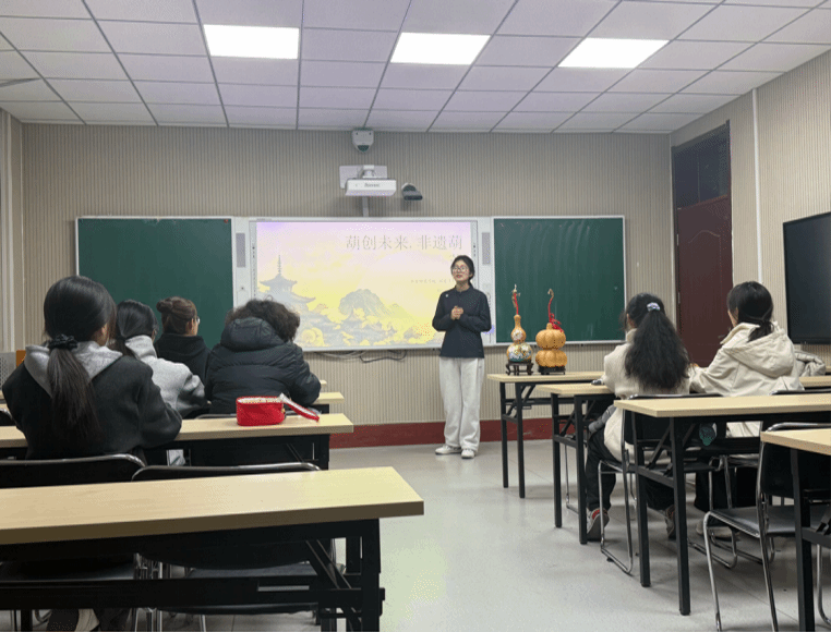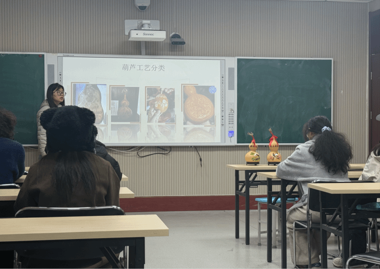 在第一期活动中,刘亚飞通过课件讲解,为同学们深入解析葫芦非遗的核心技艺,从葫芦由来切入,以通俗语言讲解其历史起源,结合多件精品葫芦非遗作品现场展示,带同学们近距离观察工艺细节,充分激发同学们参与兴趣。