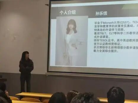 孙乐恬以简短的中英双语自我介绍开场。她从“口语学习的误区”切入,结合“创造幽默口语课堂”的教学经验,带领同学们体验了一场别样的语言学习之旅。孙乐恬通过“MBTI人格测试猜猜猜”“上大学就轻松了吗?”等流行话题破冰,用轻松幽默的方式指出,大学不是终点,而是更忙碌、更多选择、更需规划的新起点。针对不少同学关心的升学路径,孙乐恬围绕“灵活就读模式”“海外名校学历认可度”“申请的渠道”“国际化就业”等方面详细解读了中外合作办学项目的优势。