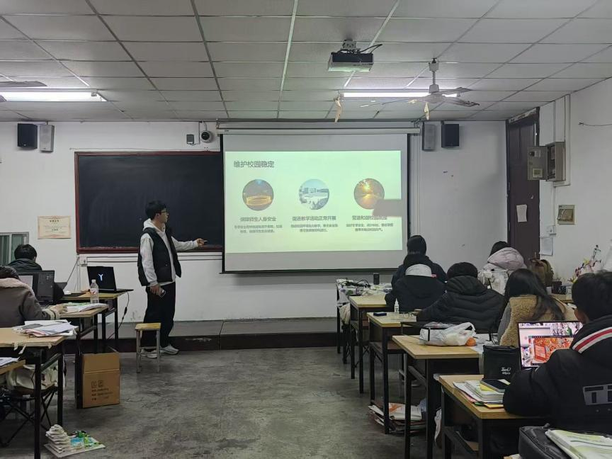 活动聚焦冬季高频安全风险,全面覆盖多类安全要点。同学们以班级为单位积极参与,各班级有序开展冬季安全教育PPT宣讲活动。宣讲内容围绕冬季宿舍用电、出行防护、健康守护等核心安全要点,条理清晰拆解安全知识与防范技巧,结合典型案例警示安全隐患,引导同学们重视冬季安全,在认真学习与互动交流中深化安全认知,夯实自我防护能力。
