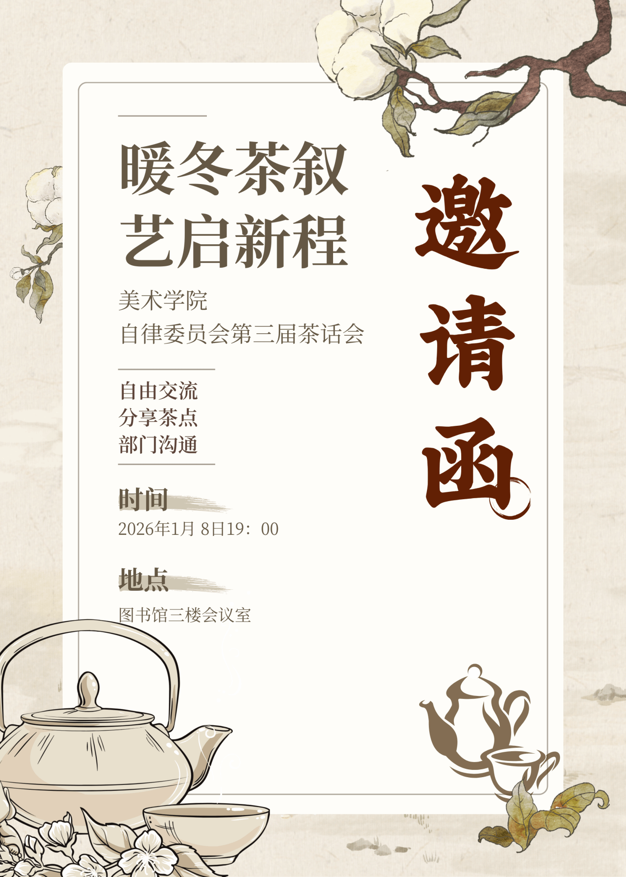 寒意渐浓,岁序将新。时光的笔触勾勒着冬的轮廓,也晕染一场温暖的相聚。一场属于美术学院自律委员会全体成员的专属之约,正待启程!品一盏暖茶,话一段并肩时光。美术学院第三届“暖冬茶叙・艺启新程”茶话会,即将温情拉开帷幕!