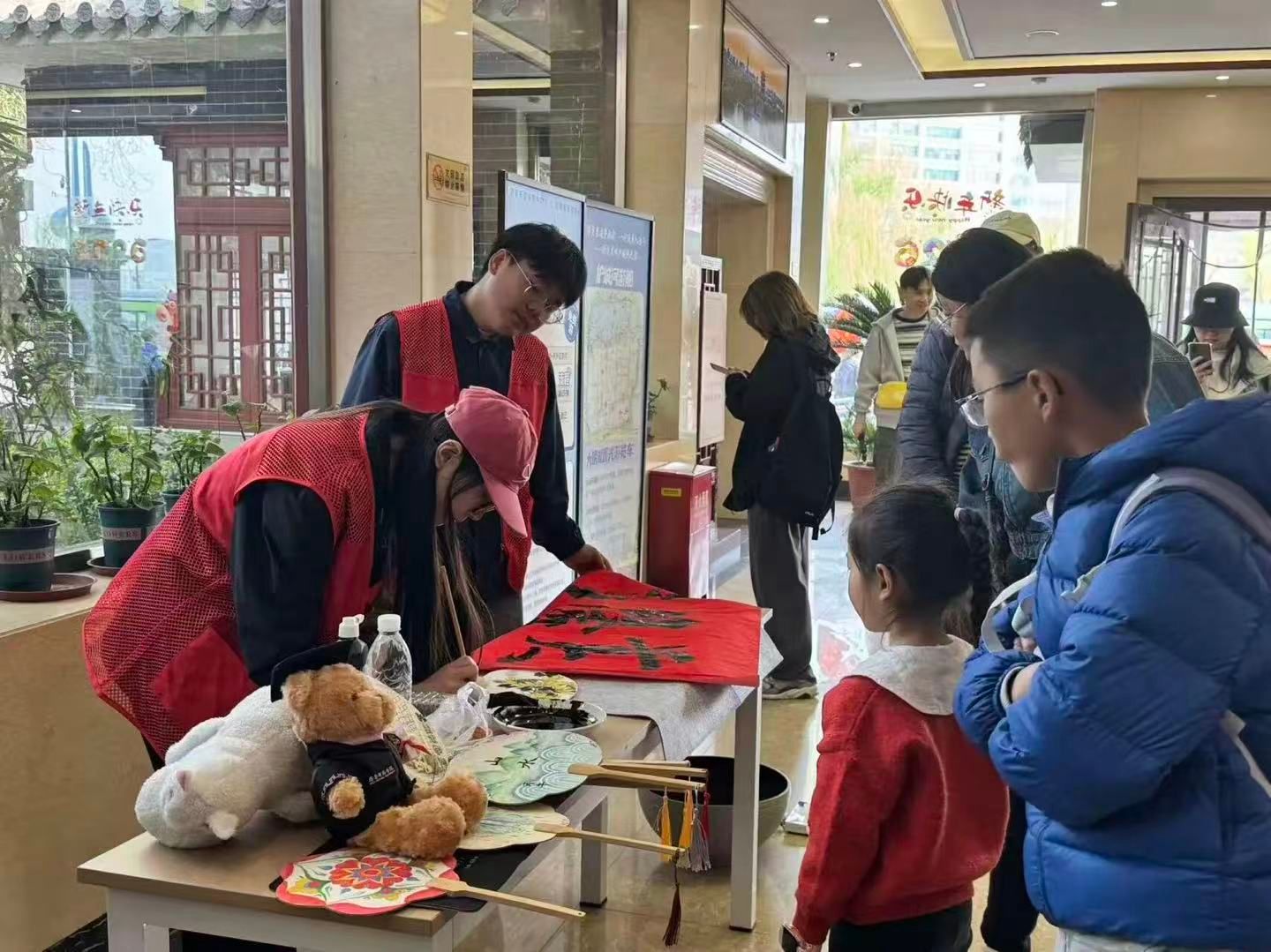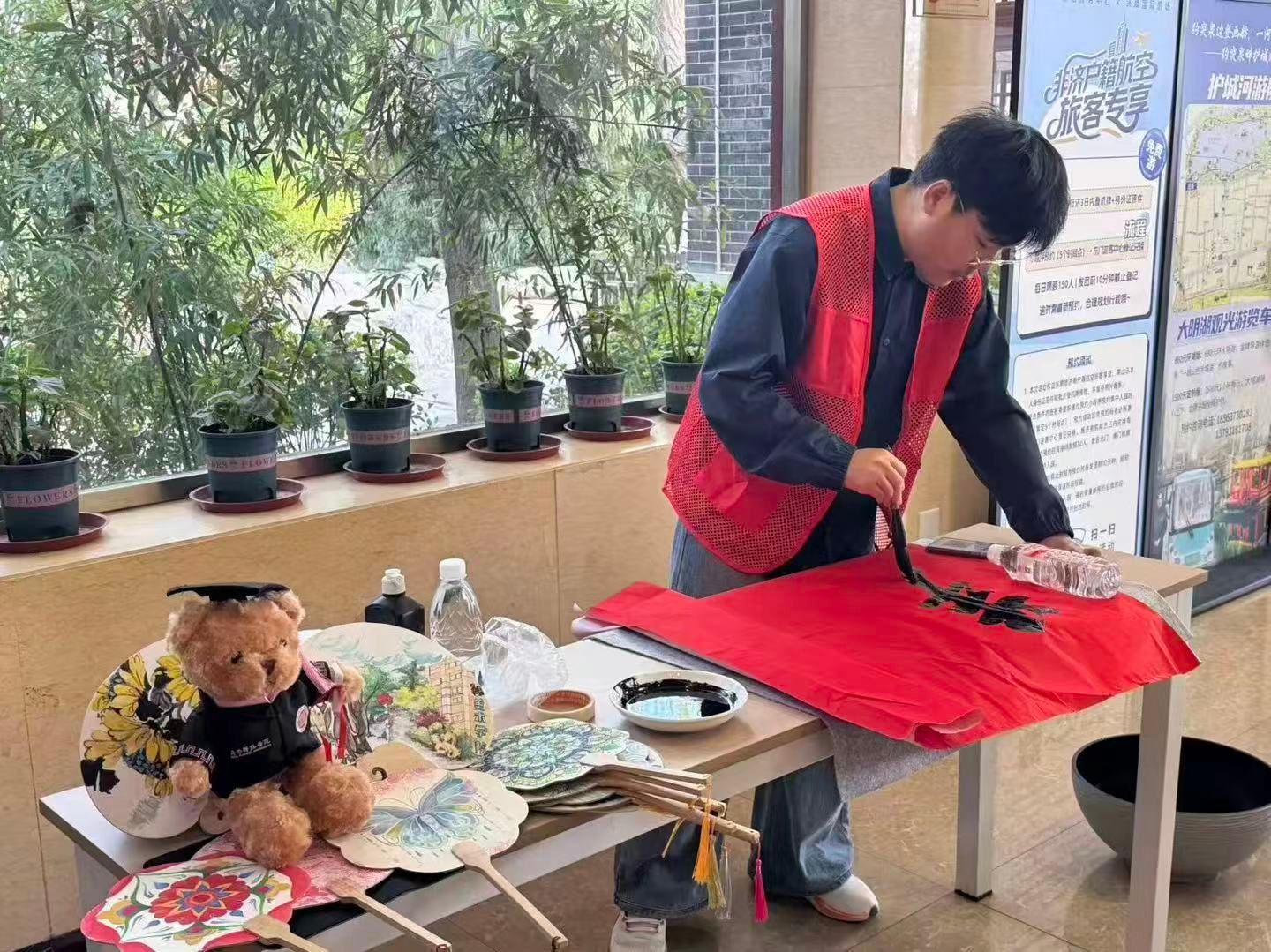 除了贴心的基础志愿服务,趵突泉景区依托本次校地合作,打造特色文化体验环节。由齐鲁师范学院师生精心创作的书法、美术、文创等精品佳作在特定区域集中展出,志愿者们化身讲解员,为游客细致解读作品背后的创作理念与文化内涵,将君子文化、书画艺术与泉水文化深度结合。