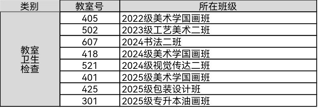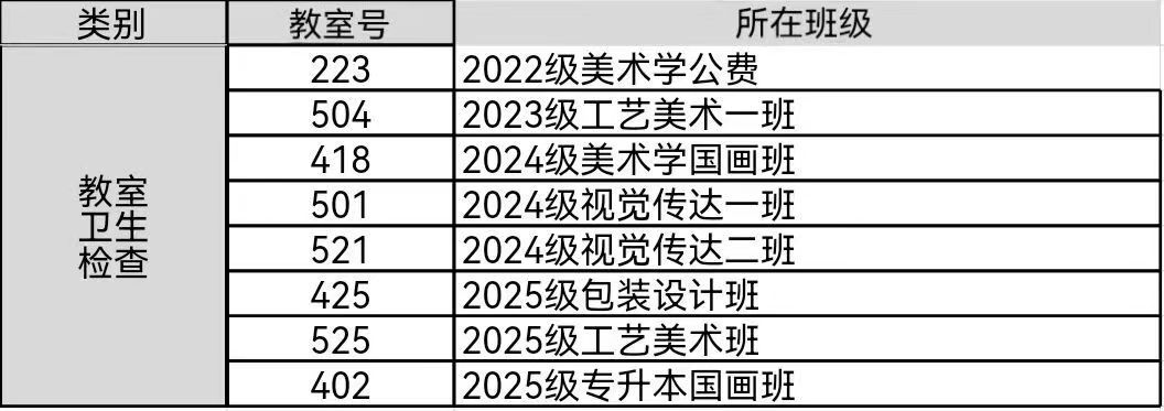 请各班生活委员、值日生切实履行职责,认真落实每日清洁任务,保持教室整洁,展现美院学子积极向上的生活态度与集体风貌。