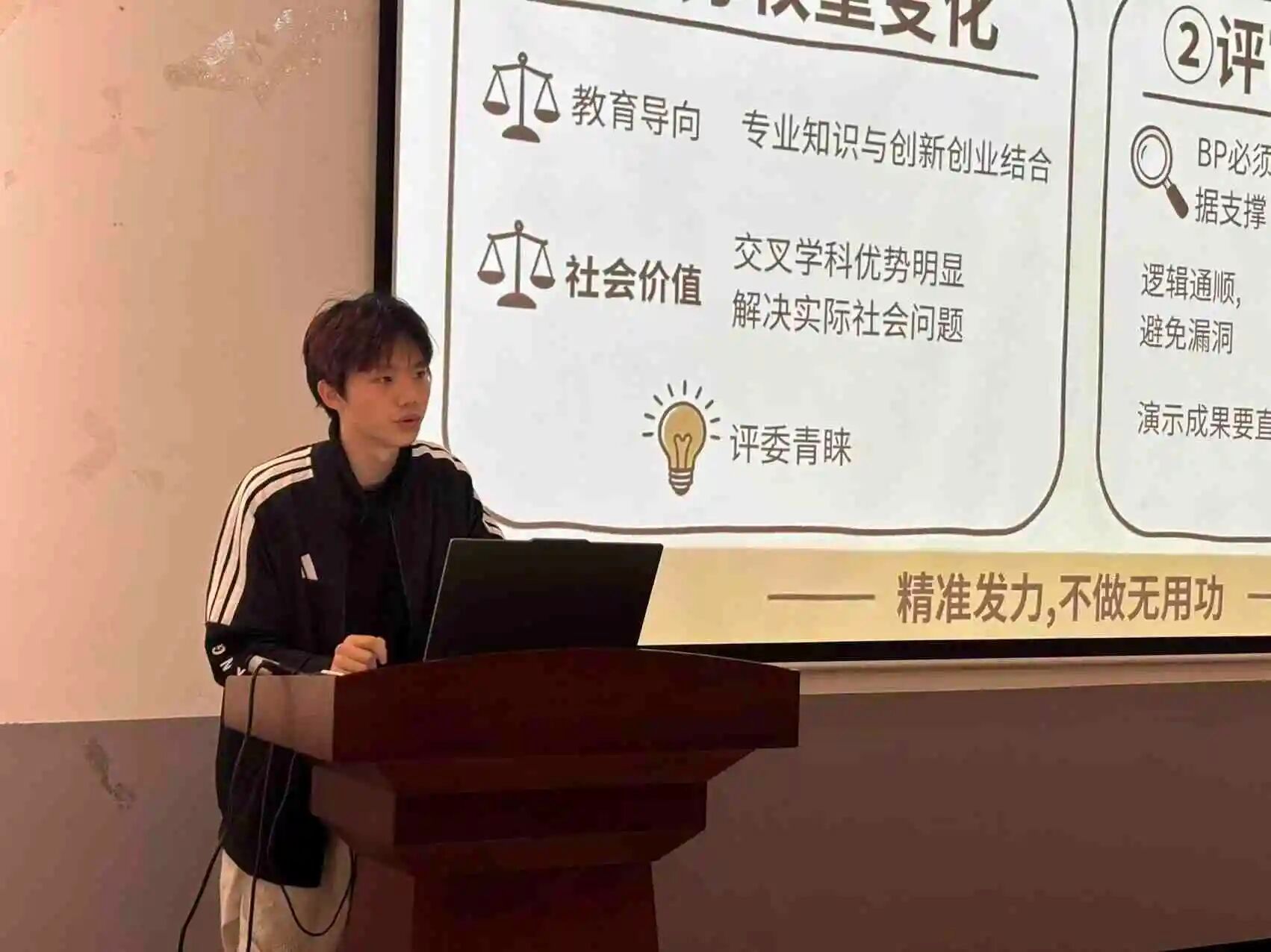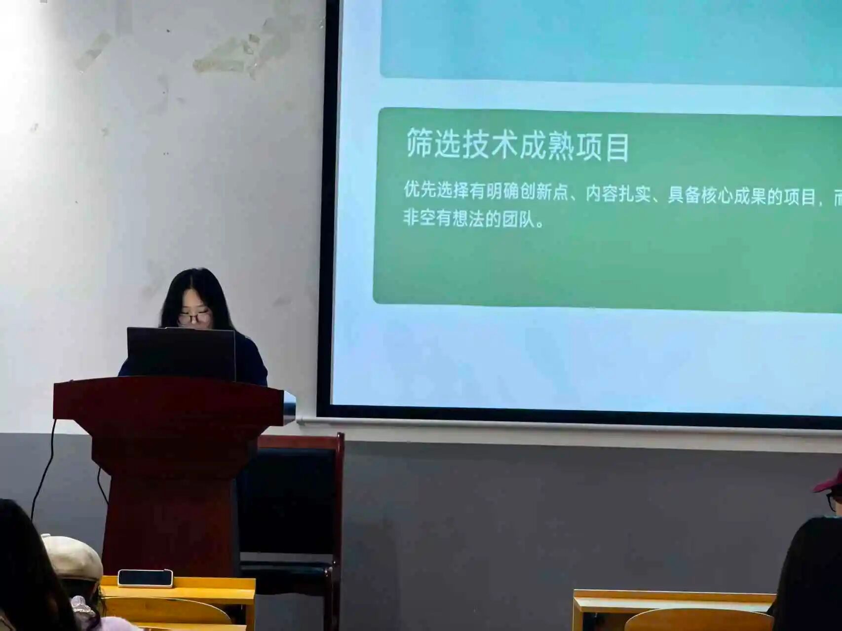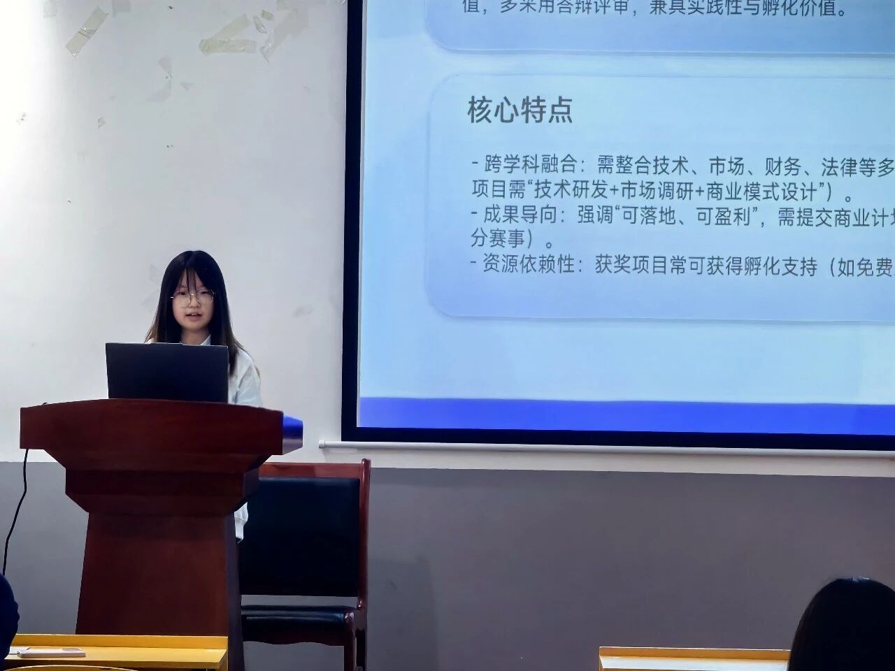 活动伊始,常馨润以“双创大赛是什么、该如何参与”为切入点,系统阐释双创赛事的核心内涵与参赛基本流程。她将政策解读与典型案例分析相结合,帮助在场同学构建清晰的赛事认知体系,明确赛事各阶段划分、评审核心标准及参赛基本要求,为同学们后续备赛工作夯实理论根基。