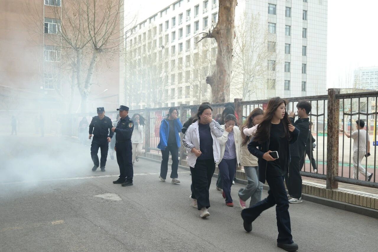 下午2点30分,随着警报声急促响起,消防安全实战演练正式开始。消防专业人员在宿舍门口模拟校园突发火情,浓烟迅速蔓延,同学们在老师的有序指挥下,迅速用湿毛巾捂住口鼻,压低身体、弯腰快步,沿着预定的安全疏散路线,快速、有序地撤离至操场,整个过程紧张有序、有条不紊,充分展现了良好的应急应变能力