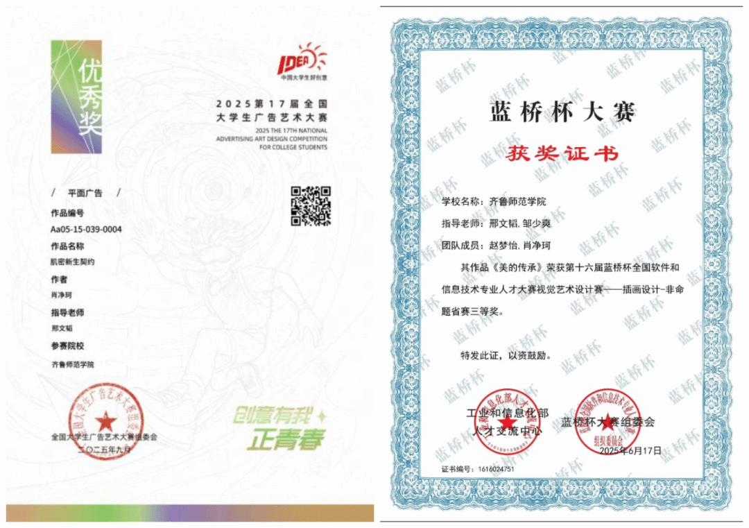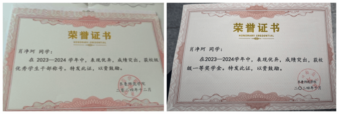 在校期间获2025年5月人才交流中心颁发的蓝桥杯大赛三等奖;2025年6月获全国大学生广告艺术大赛优秀奖;2024年10月,获齐鲁师范学院颁发的2023-2024学年“校级一等奖学金”;2025年10月10日,获得齐鲁师范学院颁发的2024-2025学年“校级一等奖学金”,2024年10月,获齐鲁师范学院颁发的2023-2024学年“优秀学生干部”称号;2025年10月,获齐鲁师范学院颁发的2024-2025学年“优秀学生”称号;2025年3月,获齐鲁师范学院颁发的“优秀团员”称号。2024年12月,获齐鲁师范学院颁发的“文艺活力之星”称号。2024年12月获齐鲁师范学院颁发的“青年之声颂华诞”大学生歌唱比赛三等奖;2025年4月,获曲阜市教育和体育局颁发的曲阜半程马拉松“优秀志愿者”称号;校级及以下获奖30项。