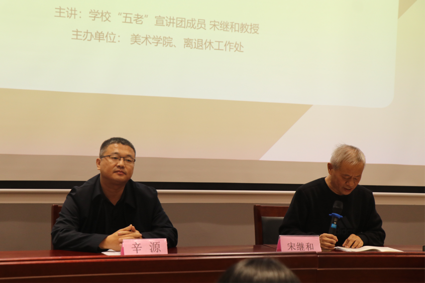 本次报告会的主题为“党的指导思想的三次飞跃”,报告会由学校“五老”宣讲团成员、“银龄美”志愿服务团成员宋继和教授主讲,美术学院党委书记辛源主持报告会。