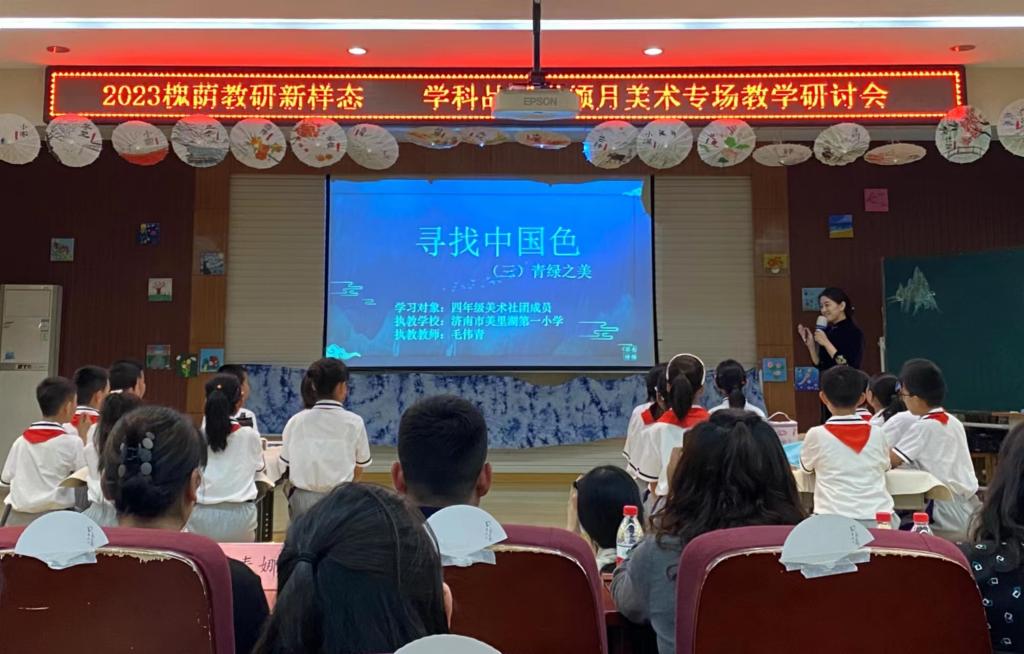 第二阶段是槐荫区教学能手毛伟青老师的“慧学课堂——《寻找中国色—青绿之美》”展示课。毛伟青老师对接新课标,以培养基础教学小学阶段学生核心素养为目的,深入挖掘中国传统文化,融合美术、音乐、舞蹈、语文等多学科,进行课程内容整合,进行大单元教学。课堂上毛伟青老师把学生放在课堂的正中央,学为中心、精教真学。教学活动中的“青绿使者”以及课堂实践环节的”作品能体现出时代新风貌;结合神舟十六号载人飞船的发射成功,融入课程思政,能够做到对传统文化传承创新的同时,培养学生热爱祖国的大好河山,热爱大美中国之情。毛伟青老师精彩的课程展示、规范的语言表达、高质量的课堂结构设计、独特的教学见解,带给参加此次观摩活动的美术学院师范生们很多新的启发与思考。
