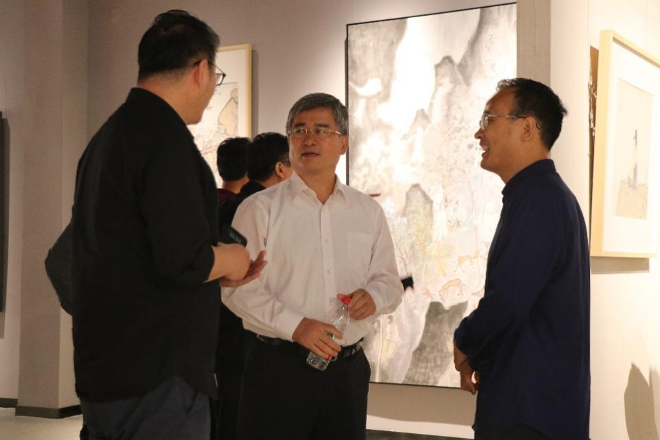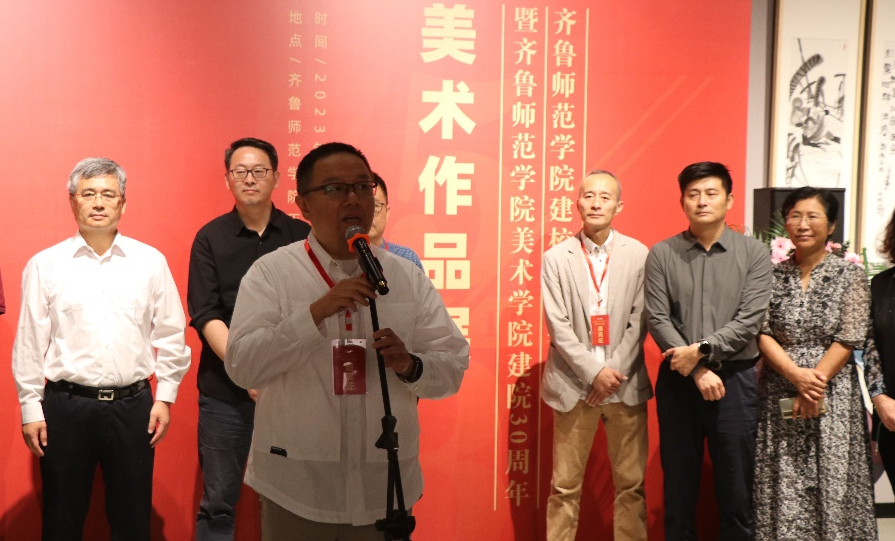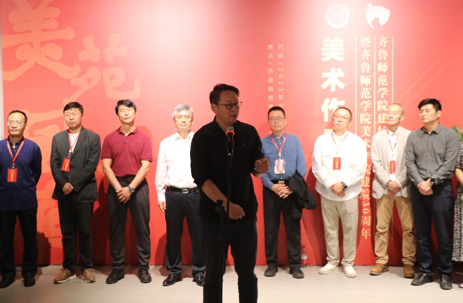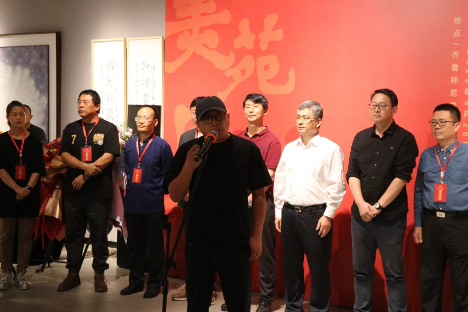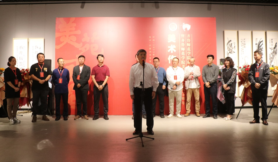 齐鲁师范学院副校长张兆明宣布展览开幕,山东艺术学院城市与设计学院院长王大海、齐鲁师范学院美术学院国画系教研室主任巩艺、齐鲁师范学院美术学院院长杨三军依次致辞。开幕式由美术学院教师王华军博士主持。