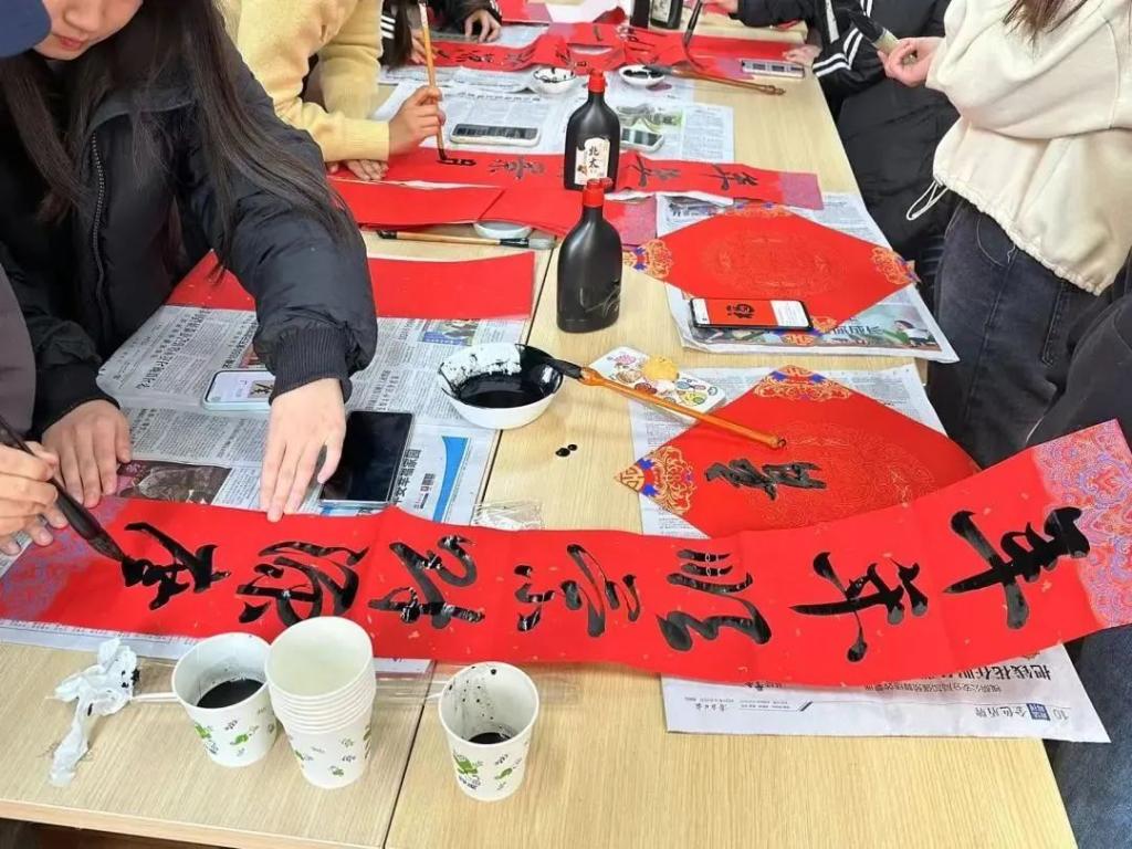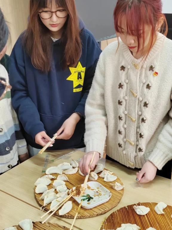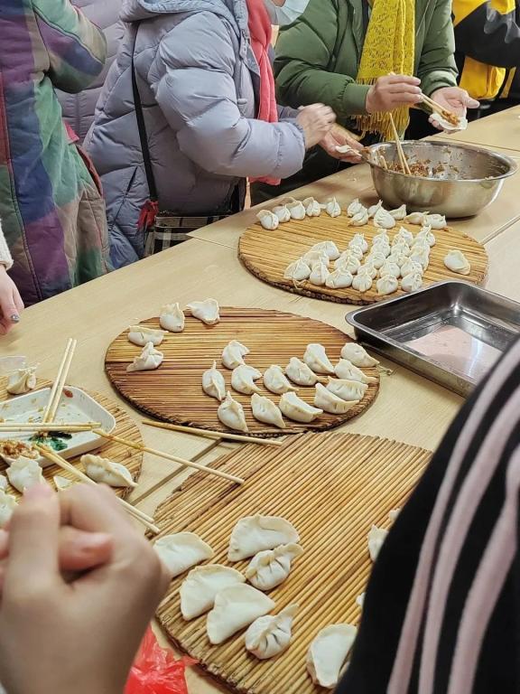 活动首先带领同学们与老党员学习思想纲要。党员们细心仔细得为学生们解答问题。活动第二项进行了包饺子活动,社区提供了面粉、馅料等制作材料,配备专业老师指导,教授饺子包法和技巧。与此同时,开展了写福字写对联活动,同学们大放异彩,一张张春联展现了同学们对未来的期待,对美好生活的向往。