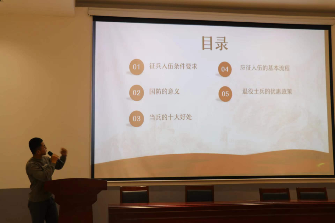 通过讲解征兵工作,使同学们了解如今的征兵政策,了解部队生活来增强矢志报国的信念,把爱国之心化为报国之行,在实现中国梦强军梦的伟大征程中,用担当奉献谱写新时代的青春华章。
