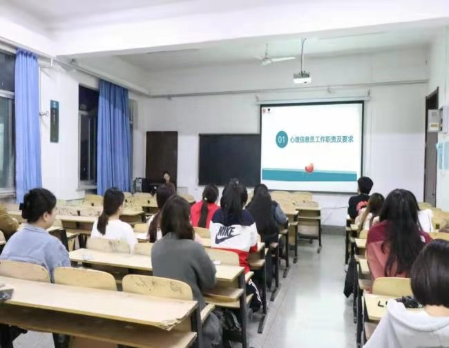 刘婷从“心理委员工作职责及要求”“大学生常见心理问题”以及“心理委员的工作技巧”等三个方面分别向心理信息员进行讲解。培训会上同学们聚精会神地听取并记录重要内容,增强其对理论知识的掌握,并从中正确理解了心理委员工作的重要性以及如何树立良好的责任感,明确自身使命。