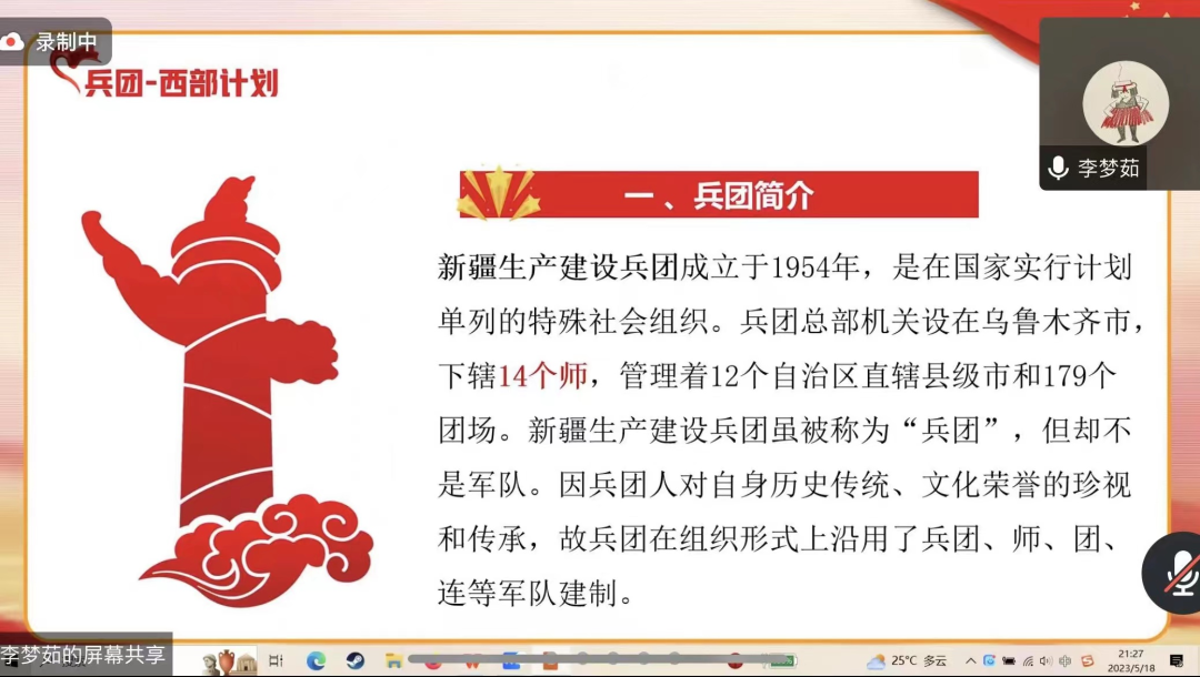 宣讲会上,李梦茹从兵团-西部计划入手,细致讲解了兵团-西部计划项目的报名事项、服务期、优惠政策、服务地分布、岗位专项类别和服务保障;以图文并茂的形式,介绍了新疆地区的独特的风土人情,地理风光和生活环境,打破了同学们对新疆的固有印象,在同学们心中种下了一颗红色的种子。同学们听后纷纷表示要在服务西部基层的广阔天地中壮筋骨,长才干,强本领,以实际行动为新疆社会稳定和长治久安总目标贡献青春力量。
