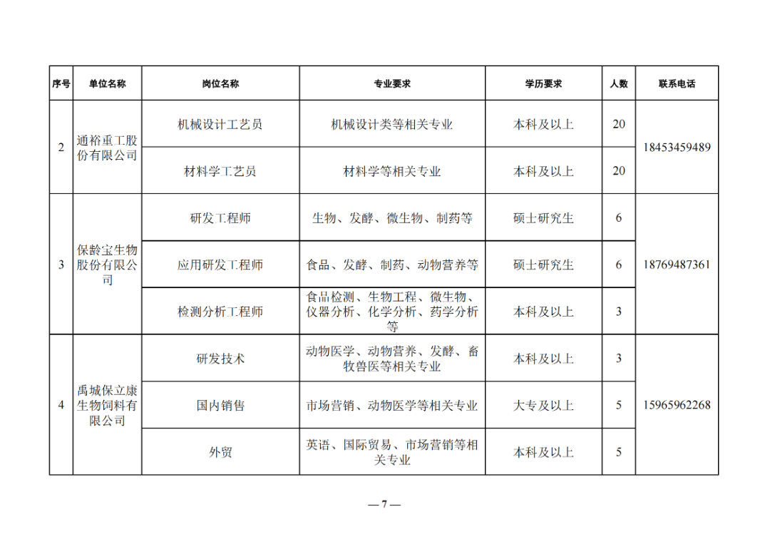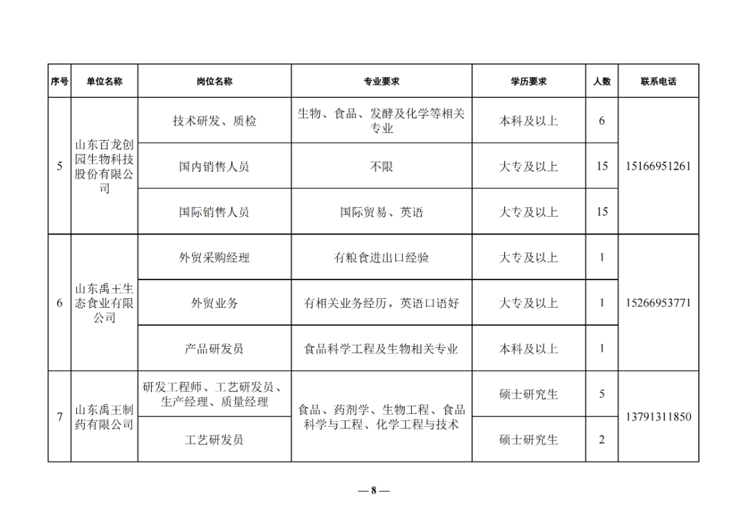 本次共征集通裕重工股份有限公司、保龄宝生物股份有限公司、山东百龙创园生物科技股份有限公司、山东禹王生态食业有限公司等26家用人单位提报人才需求808人,包括高层次人才、青年人才、技能人才三个层次。其中,13家用人单位提报高层人才需求20人,包括博士研究生11人、高级工程师9人;16家用人单位提报青年人才需求531人,包括硕士研究生251人、大学本科167人、专科及其他学历113人;8家用人单位提报技能人才需求257人,包括大学专科及以上学历83人、其他学历174人。