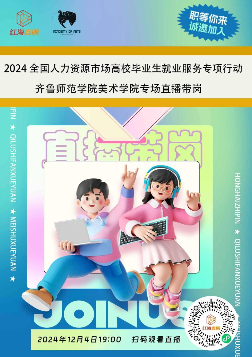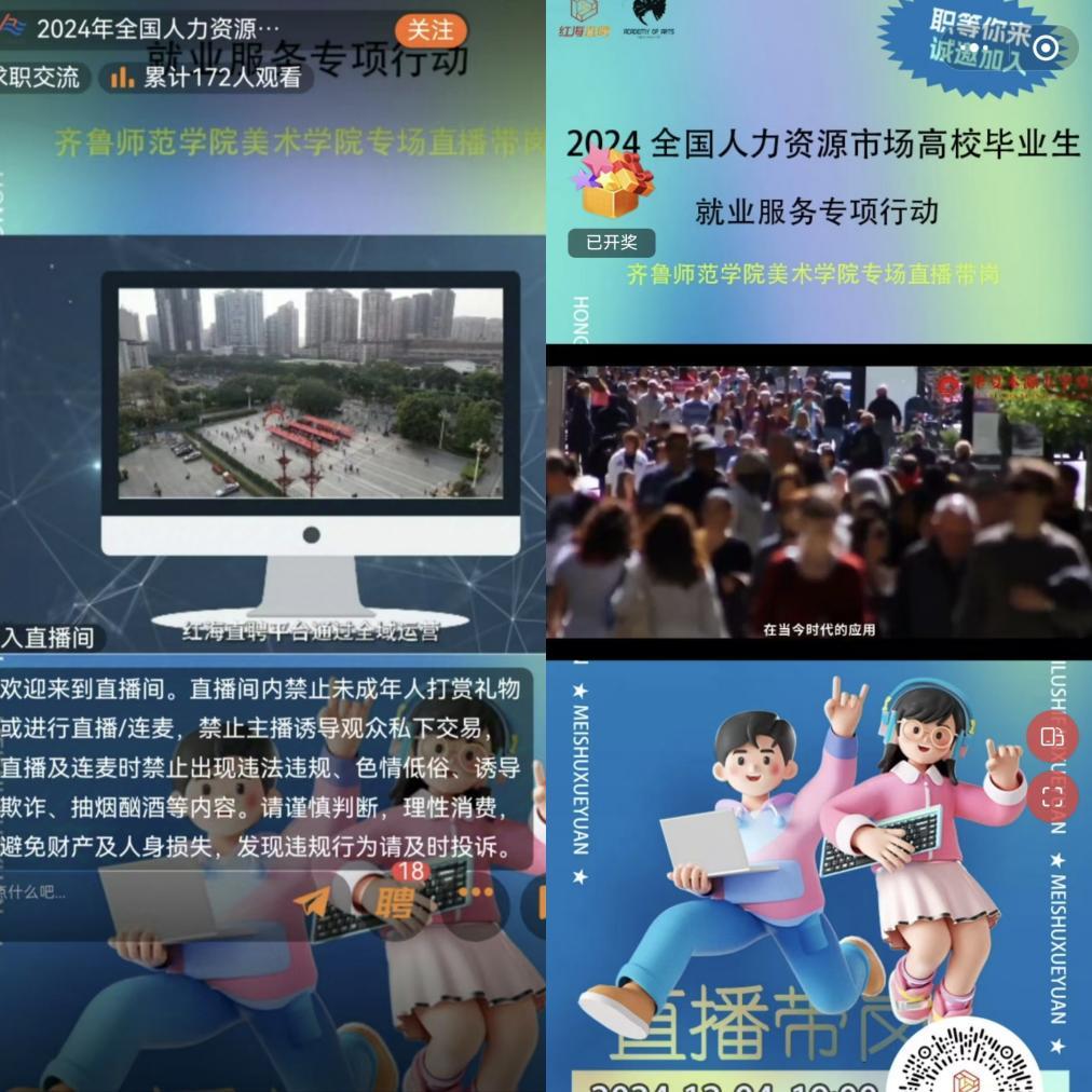 为促进高校毕业生高质量充分就业、推动高校毕业生市场化社会化就业,进一步加强人力资源供需对接,实现用人单位与毕业生的双向奔赴、共赢发展,12月4日,美术学院举办了线上直播带岗2024 年全国人力资源市场高校毕业生就业服务专项行动--“禾为计划”专场招聘会。