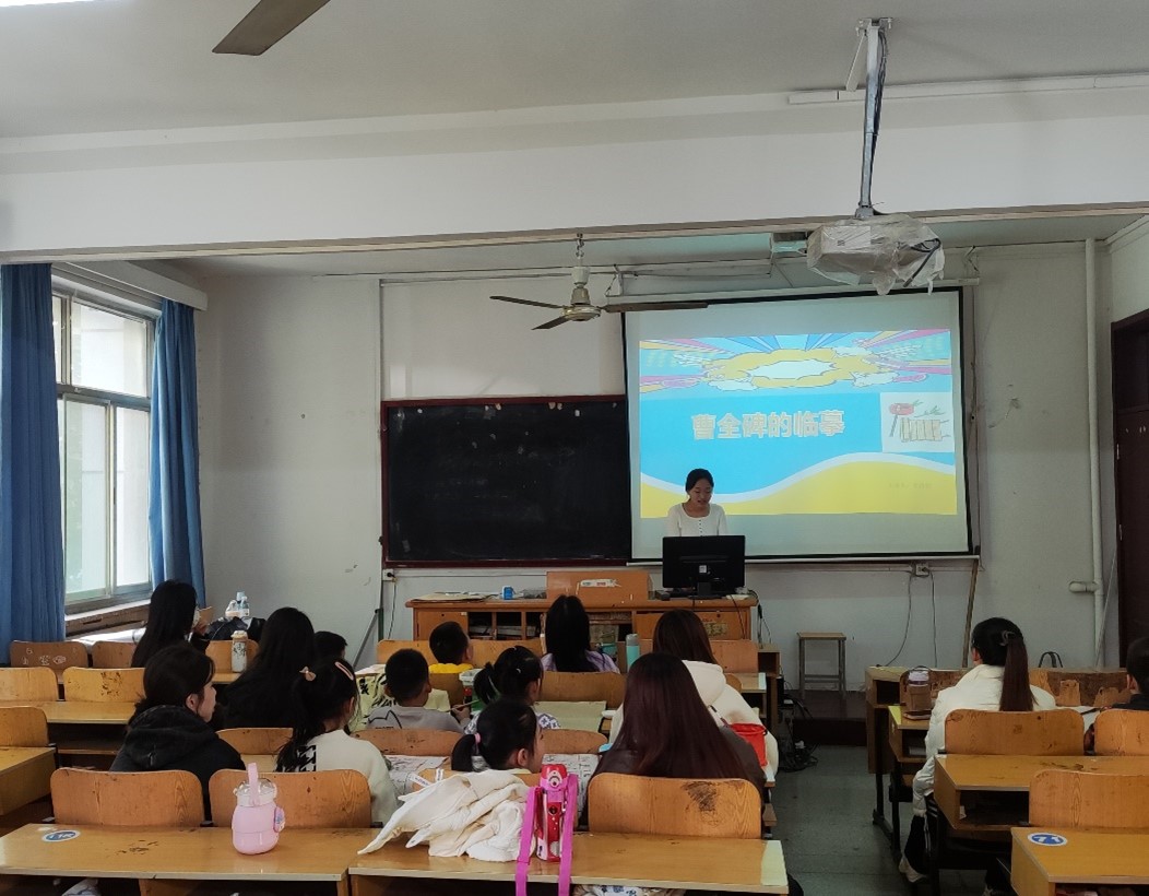 本次课程以临摹汉代隶书中的典型代表《曹全碑》为主。课程开始,授课教师先带学生们回顾了上节课讲授的知识—隶书笔画的写法,期间,穿插了有关《曹全碑》的小故事,使学生们对《曹全碑》这一碑帖的学习产生探索和求知的兴趣。课中,分析讲解《曹全碑》的三个主要的风格特点,使学生们对隶属中“扁”、“圆”、“放”的书写要领有了完整的认识,让同学们更能精准的临摹。