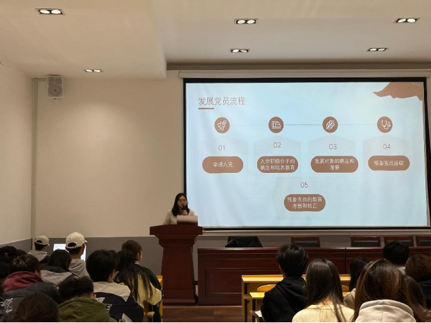 蔡乐霏同学对入党流程进行了详细讲解,分别从入党申请书,积极分子的确定和培养教育,发展对象的确定和考察,接收预备党员以及预备党员的教育考察和转正五个步骤以及群团意见,党内意见,上级党委等多个层面进行讲解。