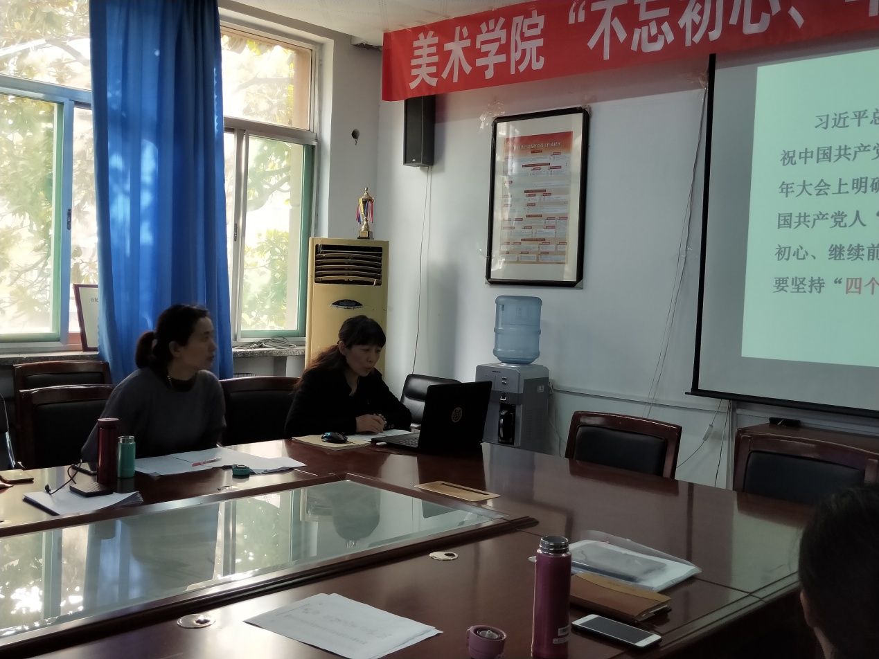 为扎实推进“不忘初心、牢记使命”主题教育,2019年11月1日下午,齐鲁师范学院美术学院教师党支部在209会议室参加全体党员会议,开展主题教育专题党课,专题党课由教师党支部书记李冉主讲,教师党支部全体党员参加了学习。