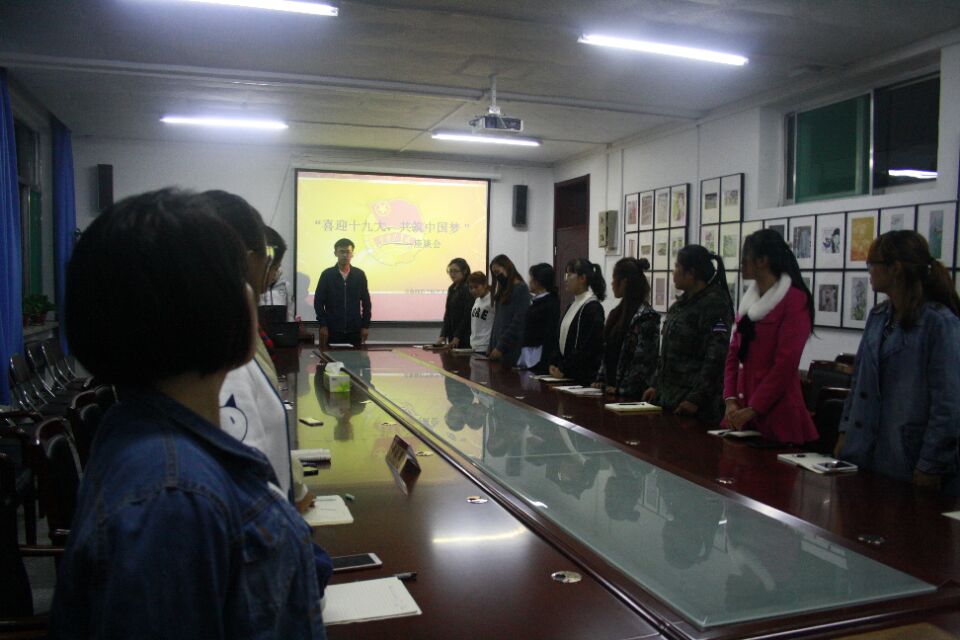 10月16日晚7:00,美术学院于209会议室举行了“喜迎十九大 共筑中国梦”座谈会。本次会议由学生会主席张鸿志主持,杨雪涵老师及各班团支部书记到场参会。