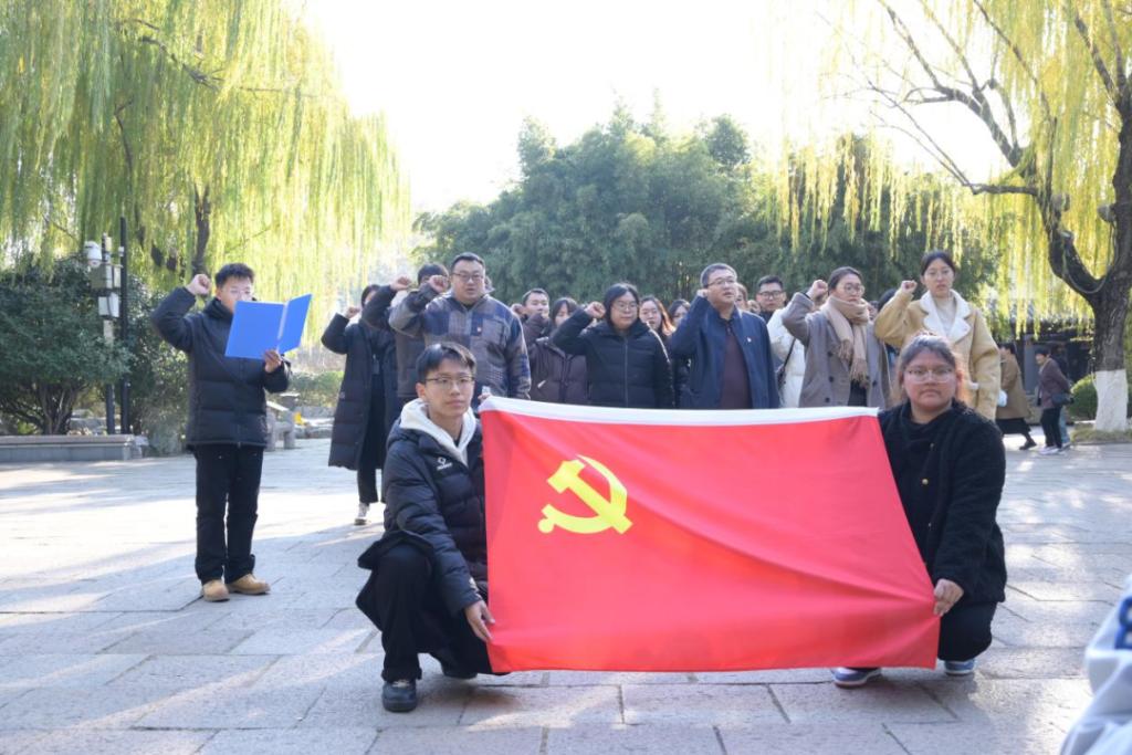 参观结束,全体党员齐聚美铭广场,瞻仰王尽美、邓恩铭烈士纪念碑宣誓仪式。学生党员王世豪同志带领新预备党员面向烈士纪念碑宣誓。同学们身姿挺拔、神情肃穆,面向党旗高举右拳,在领誓人的带领下,洪亮有力的誓词响彻广场:“我志愿加入中国共产党,拥护党的纲领……”声声誓言,是他们对党忠诚、为民服务的庄严承诺,彰显接续奋斗的决心。