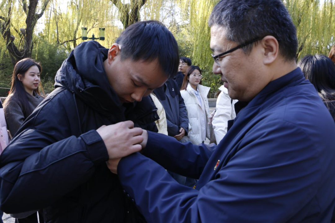 宣誓结束后,教师党员们手持党徽,逐一为新预备党员佩戴。崭新党徽佩戴在胸口,是共产党员身份的象征,更是责任与使命的标志。预备党员们目光坚定,胸前的党徽时刻提醒着要以党员的标准严以律己,践行初心,传承红色基因。