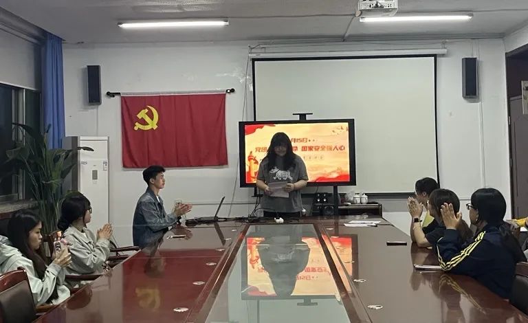 随后,学生党员邢艺歆同志为同学们讲解安全教育知识。她通过结合自身的学习与实践经验,从大学生的视角出发,分享对国家安全的理解。她提到,在网络信息时代,大学生应提高警惕,防范网络窃密,保护个人隐私,不随意传播敏感信息,用实际行动维护国家信息安全,其建议贴合学生生活实际,引发同学们的强烈共鸣。