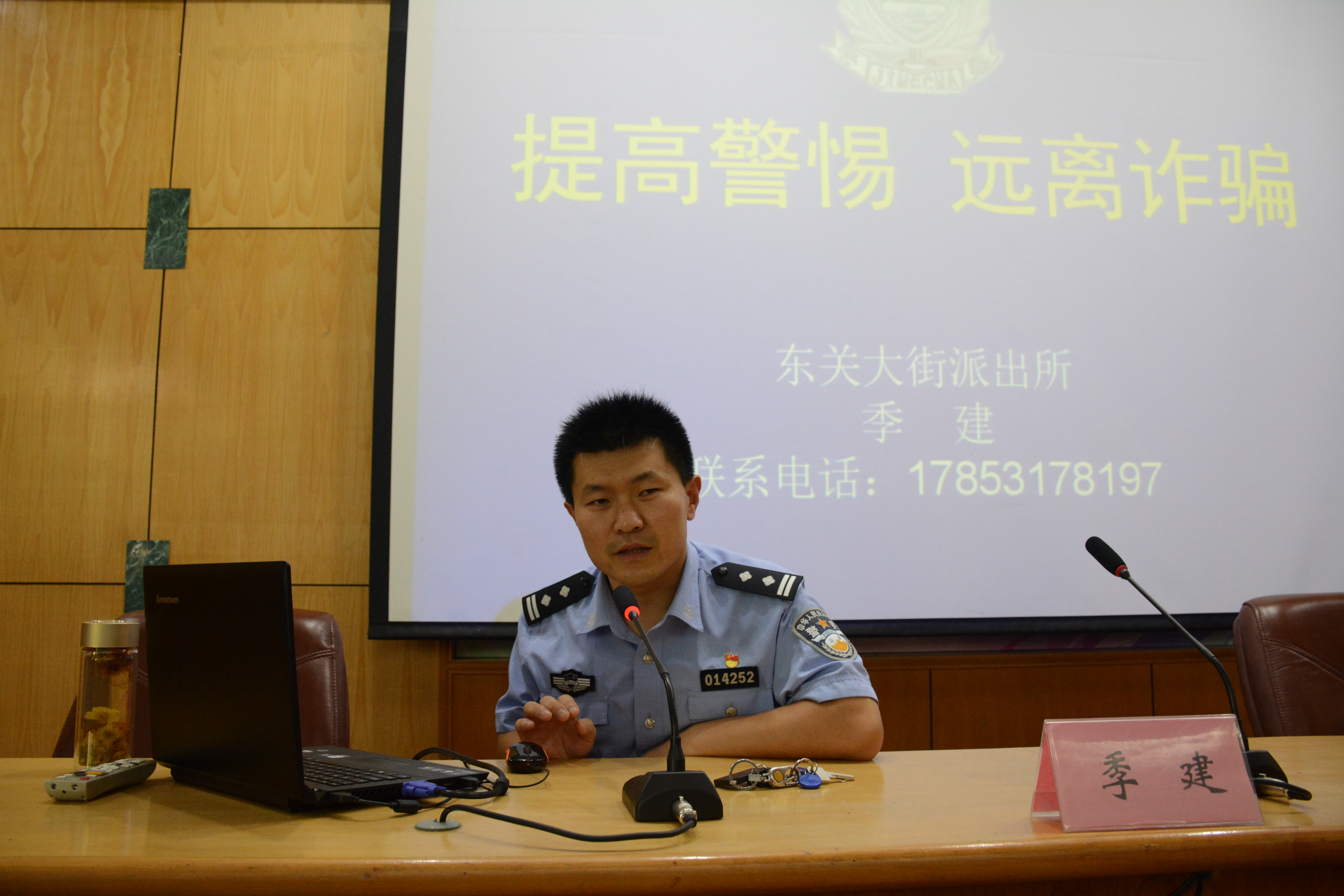 讲座围绕强化安全意识、校园治安安全、消防安全等几个方面展开。季健警官结合高校校园常发和多发案例,通过列举大量真实的案件,生动形象地讲述了防毒、防盗、防骗、等几个方面的安全教育内容。引导同学们深入认知校园安全问题,如何防诈骗,减少个人财物损失,提醒大家提高安全意识,教育大家抵制邪教组织、增强法制观念、杜绝犯罪行为、防范安全事故。