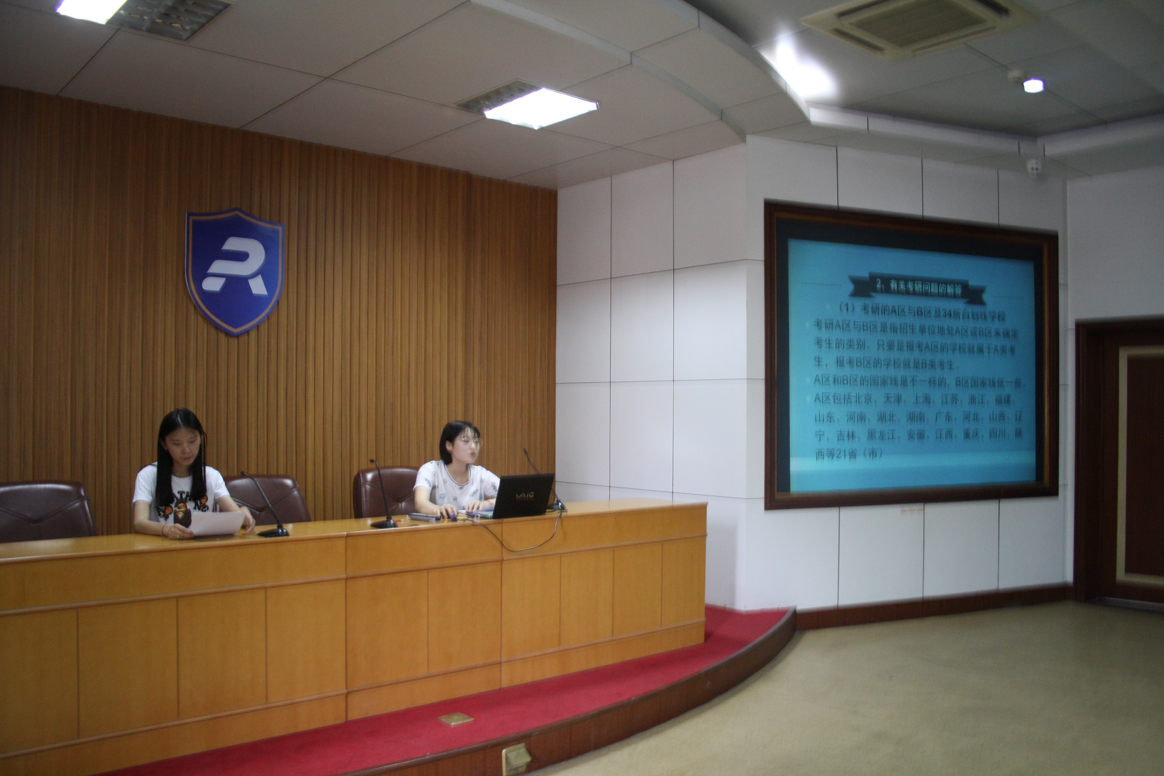 讲座期间,首先四位有丰富考研经验的学长学姐向同学们描述了研究生的意义及就业前景,为我们解读了考研这两个字的含义,理清了考研的动机,讲解了考研的学习重点。通过举例和分析历届录取分数线鼓励大家确定目标,努力学习,让同学们更加认清当前的考研形式。并就如何择校选专业、如何准备研究生各阶段考试、如何安排学习时间提出很多很好的建议。