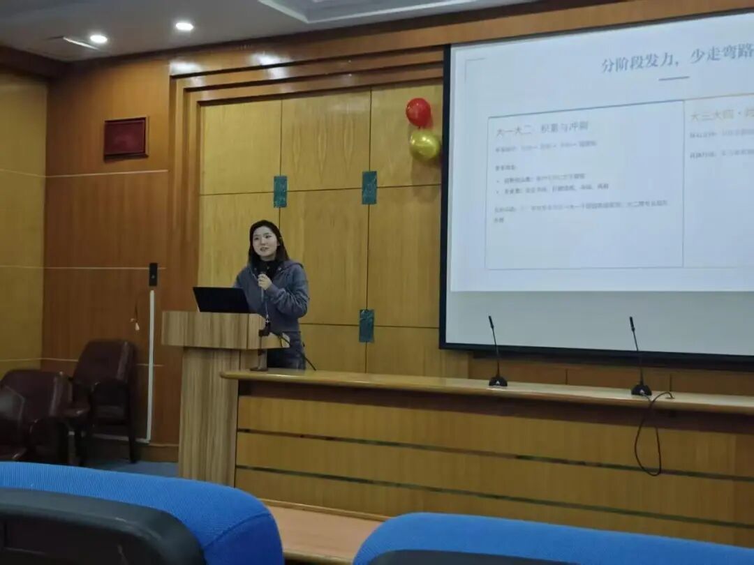 郑文悦聚焦竞赛相关内容,为同学们梳理清晰的备赛路径。她分享了高效备赛技巧,可以利用课上时间打磨作品,及时与导师沟通获取专业指导,还提醒大家做好大学阶段的竞赛规划,建议在大三下学期前完成证书考取与竞赛冲刺,避免大四被各事务分散精力。