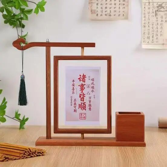 2025级美术学国画班郜若冰以中式美学与当代实用结合,选用原木作为主体材质,保留木材的温润质感,搭配榫卯式的支架结构,是对中式传统家具工艺的致敬。上方的挂架既可悬挂流苏挂饰增添雅致感,又能稳定支撑相框,让它既是一件实用的展示工具,也是一件有东方韵味的桌面摆件。把“自我提醒”转化为具有仪式感的物件,在传递正能量的同时,也提升了桌面的文化氛围。