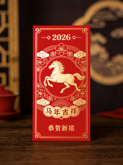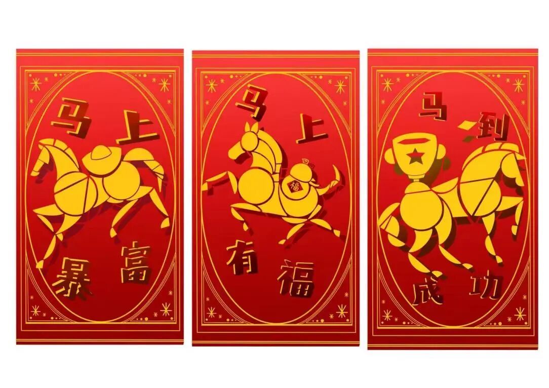 2024级包装设计一班李瑜瑶以马年生肖为核心设计红包文创,融合“马上发财”“马上封侯”“马上平安”三大吉祥谐音梗,用Q萌卡通马形象结合传统喜庆配色,传递马年专属祝福。整体风格兼顾传统年味与年轻群体偏好的萌系审美,适配多元社交与馈赠场景。