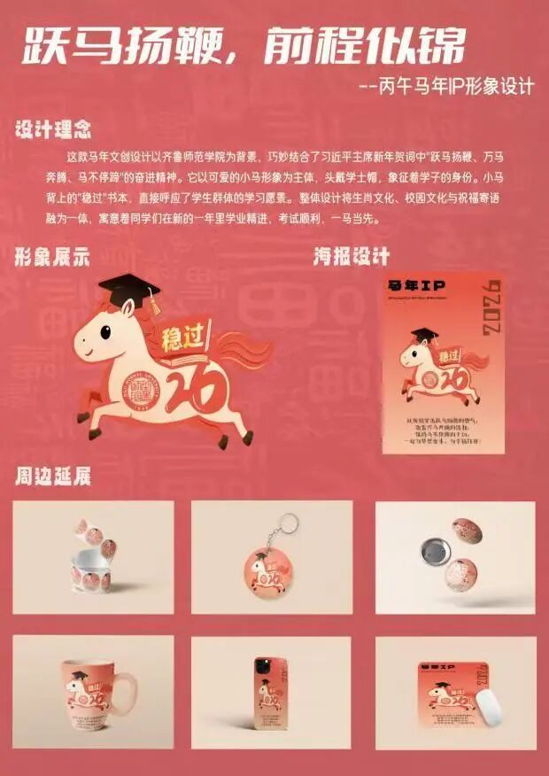 2024级视觉传达设计四班赵心雨以齐鲁师范学院为背景,巧妙结合习近平总书记新年贺词中“跃马扬鞭、万马奔腾、马不停蹄”的奋进精神,设计了这款马年文创作品。它以小马形象为主体,头戴学士帽,象征着学子身份。小马背上的“稳过”书本,直接呼应了学生的学习愿景。整体设计将生肖文化、校园文化与祝福寄语融为一体,寓意着同学们在新的一年里学业精进,考试顺利,一马当先。