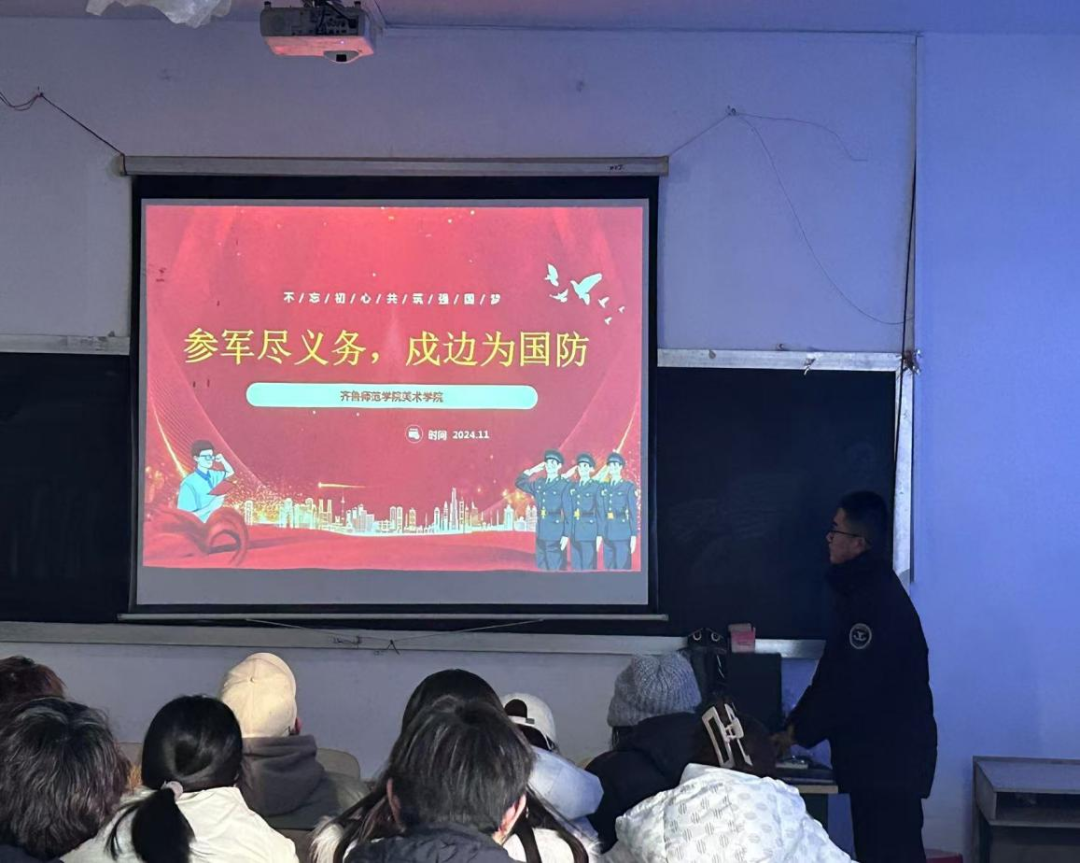 为深入贯彻落实中央军委国防动员部兵役征集工作,激励更多的优秀大学生踊跃参军入伍、献身国防,向部队输送德才兼备、素质过硬的兵员,11月27日,美术学院在327教室特开展“参军尽义务,戍边卫国防”专项活动。本次活动由国防社指导老师孟令强和国防社负责人申超主持,24级班长和国防社成员参会。