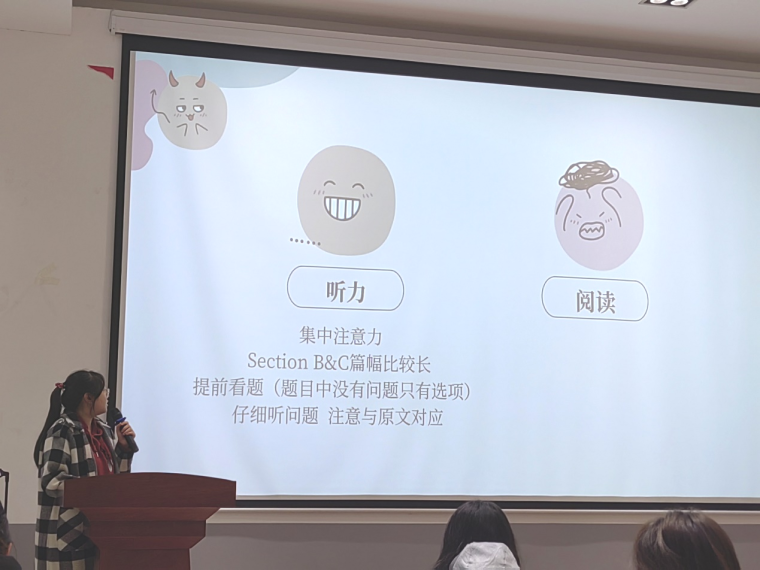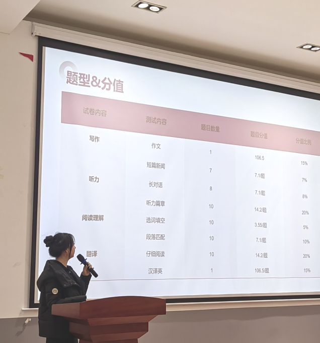 宋佳骏从题型分析与考试流程、制定合理的学习计划、三个板块逐个突破和心态调整与考前准备四个部分进行了经验分享。其中制定合理的学习计划是最为关键的一点,可以将学习内容分为听力、阅读、写作和翻译四个部分,每天集中精力攻克一个部分,从而确保全面复习。随后又对考前可能会出现的问题进行一一讲解,为同学们答疑解惑,使同学们收获颇多。