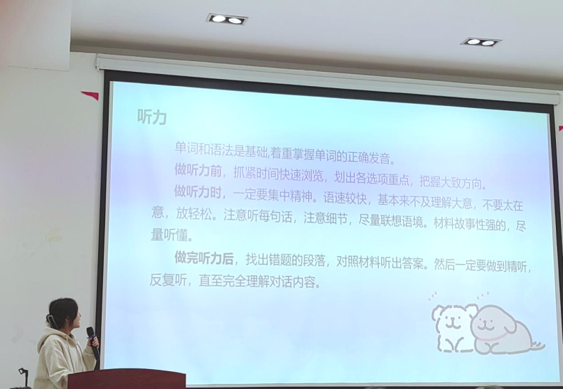 邵梦滢从复习、时间规划以及心态调整三个方面分享了自己的经验。在考试前要及时复习,巩固好听力、阅读、翻译、作文四大模块。也同时强调了时间规划的重要性,考前熟悉好考试流程,正确分配考试时间保证考试的顺利进行,考试时稳定发挥。最后告诉同学们考前的心态很重要,积极的心理暗示、疏导压力、转移注意力可以有效缓解内心的焦虑,好好休息有充足的精力备考并预祝同学们四六级考试取得理想成绩。