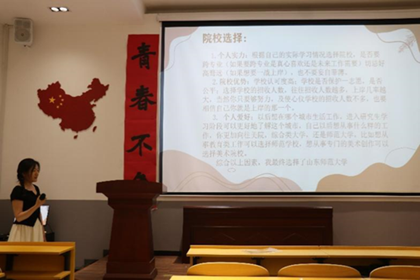 为进一步加强学风建设,帮助同学们对考研有更进一步的了解和认识,明确发展前景,提高学习积极性,5月23日,美术学院举办“五四薪火传考研 青春逐梦铸华章”考研经验分享会第二期。分享会由美术学院2024年成功考入硕士研究生的同学主讲,美术学院辅导员李玉涛老师出席会议。
