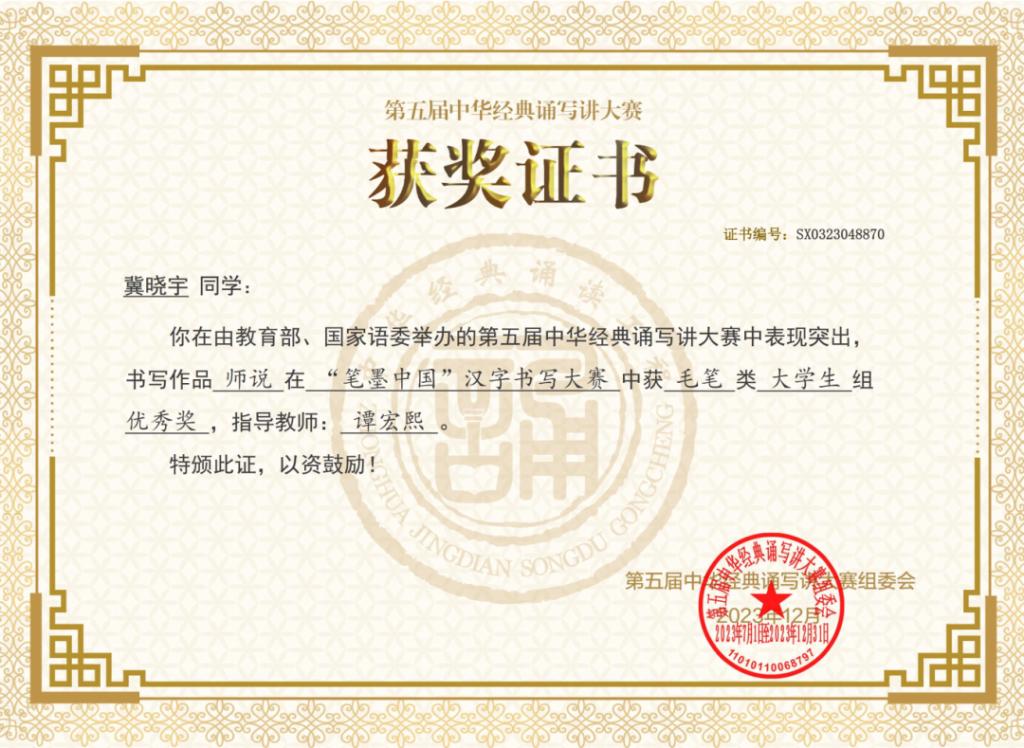 冀晓宇,2020级书法学一班,中共预备党员。在校期间曾获山东省师范类优秀毕业生、山东省政府奖学金、第五届“互联网+”大学生创新创业大赛三等奖、入展山东省第七届大学生艺术展演、第四届中华经典诵写讲大赛-“笔墨中国”汉字书写大赛优秀奖。现已考入齐鲁工业大学中国书画方向。她说,心如花木向阳而生。
