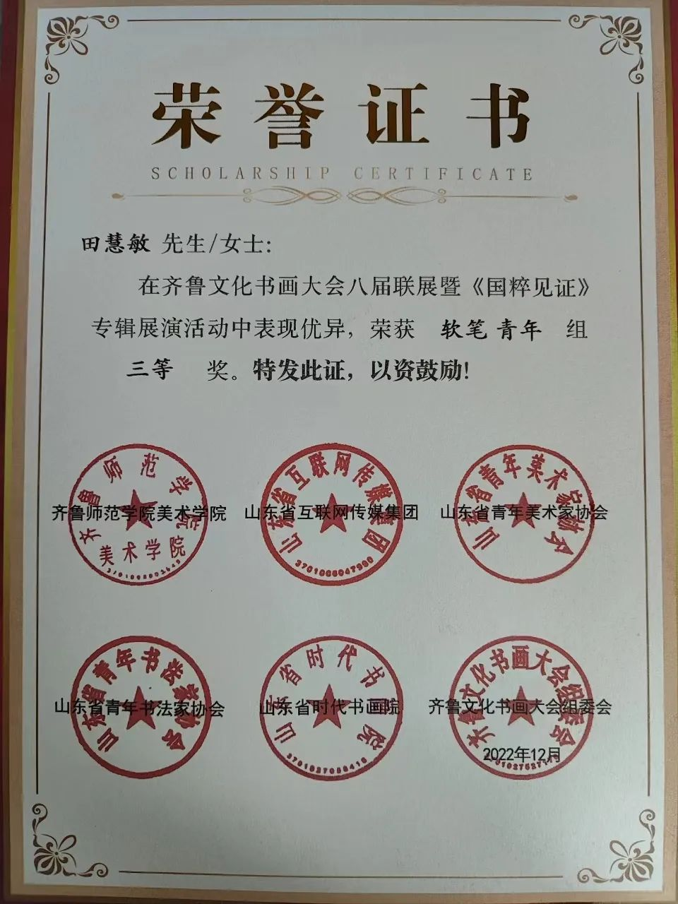 2020级书法学专业,共青团员,大学期间曾获齐鲁文化书画大会八届联展暨《国粹见证》软笔青年组三等奖。现已上岸济南大学书法学专业。她说,总不能还没努力就向生活妥协吧。